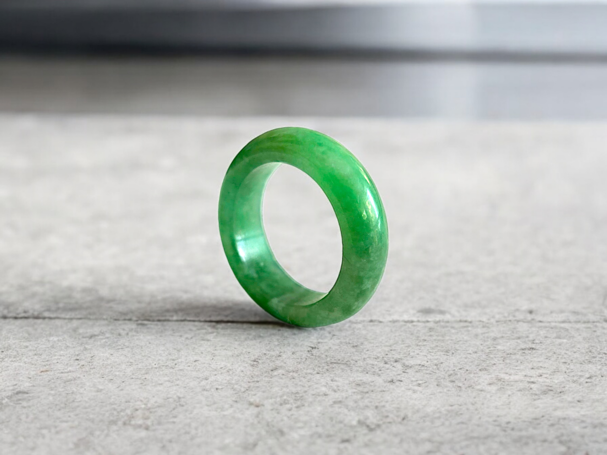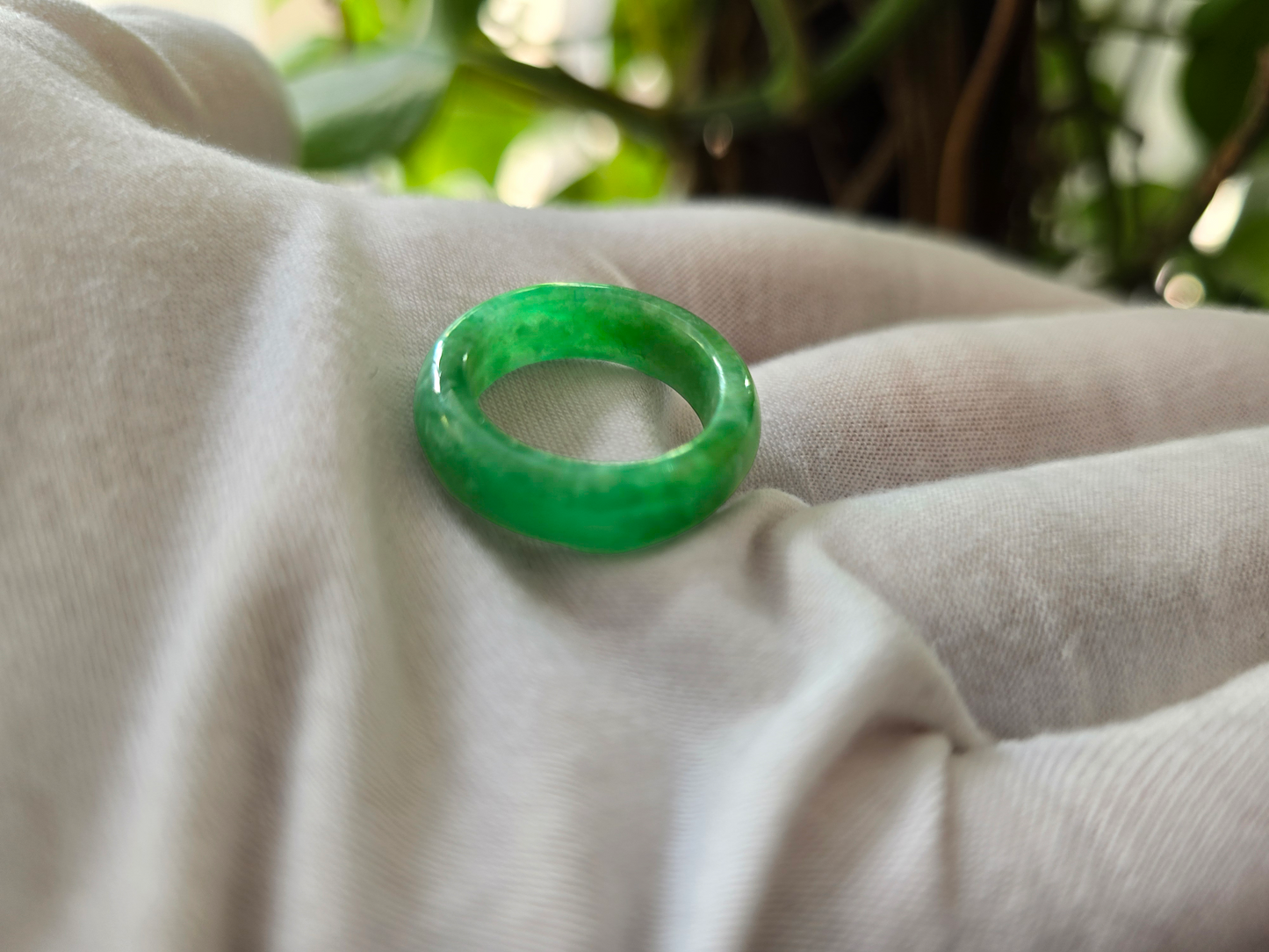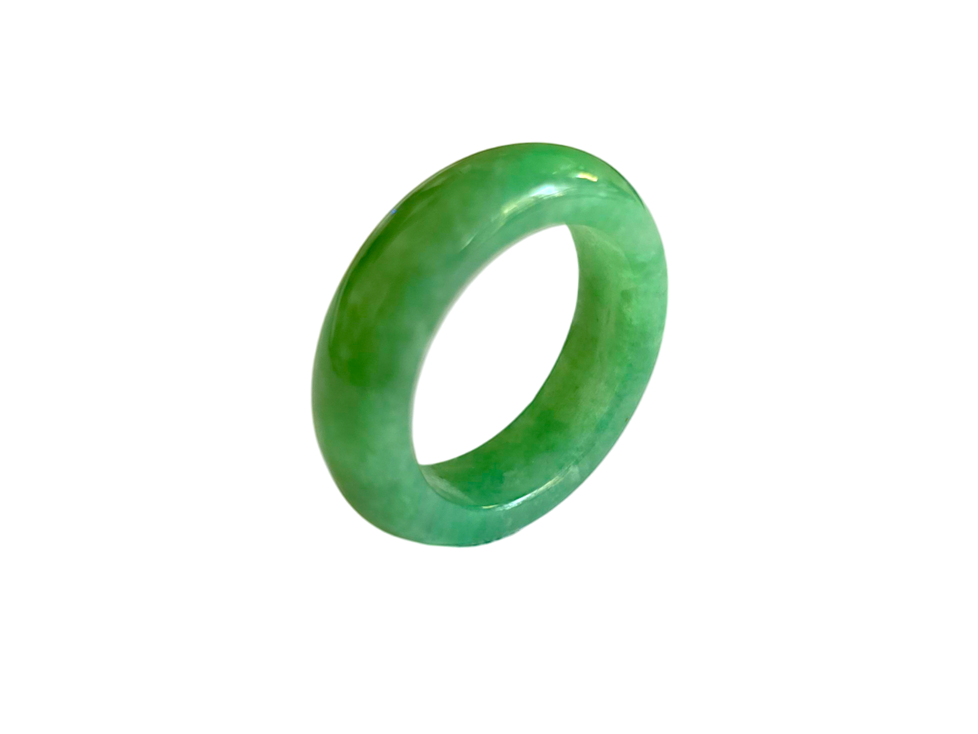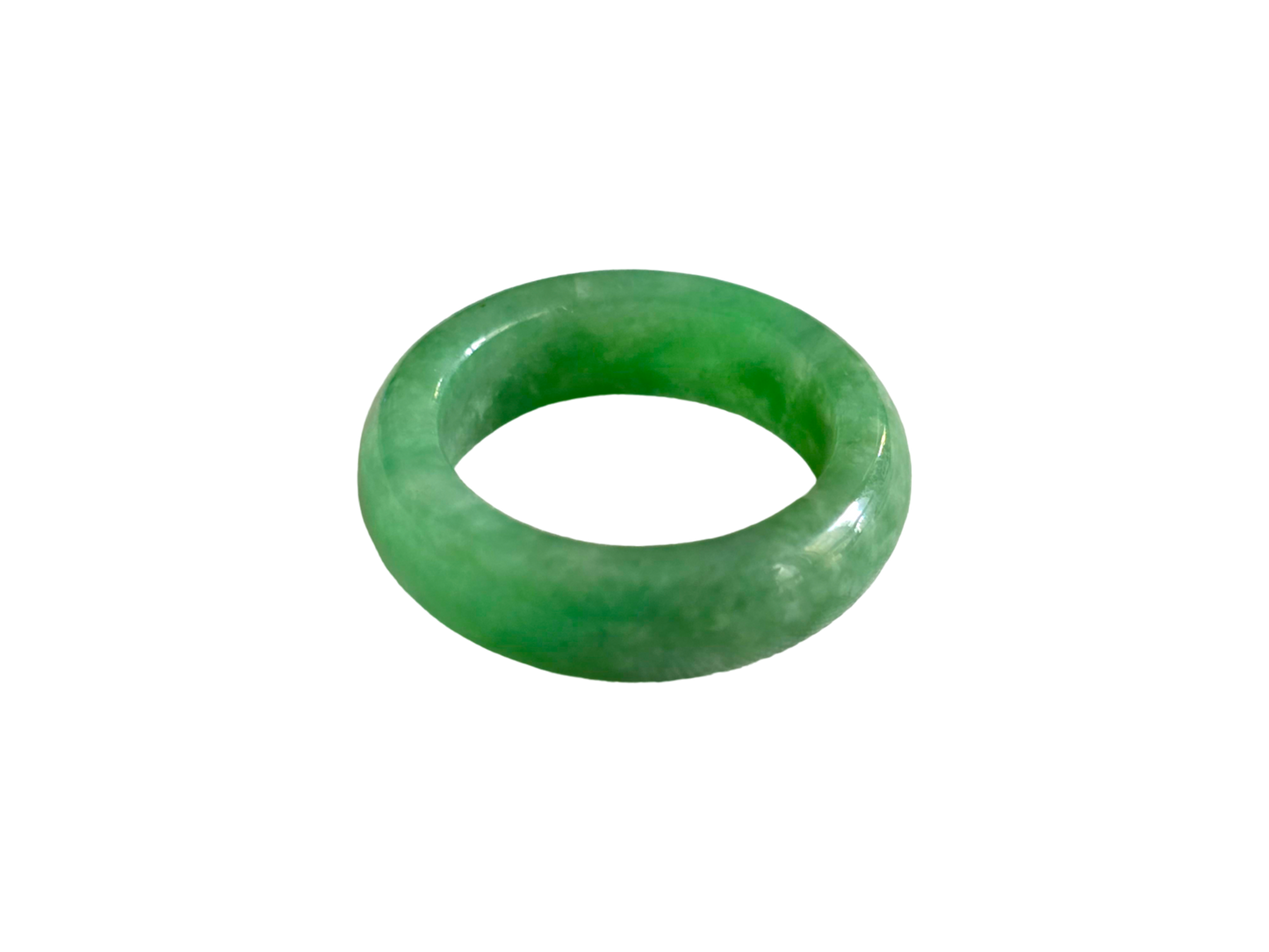 Our finest and most translucent series of Burmese A-Jadeite Infinity Band Rings. Our handpicked exclusive Jadeite is crafted into unique rings, each with the ideal optics and strength. Each ring is unique and exclusively One-of One. With fibrous interwoven hues, this jadeite has a rich green tone with splashes and streaks of Imperial Jadeite. Perfect luster and light, and no cracks or blemishes on the ring.