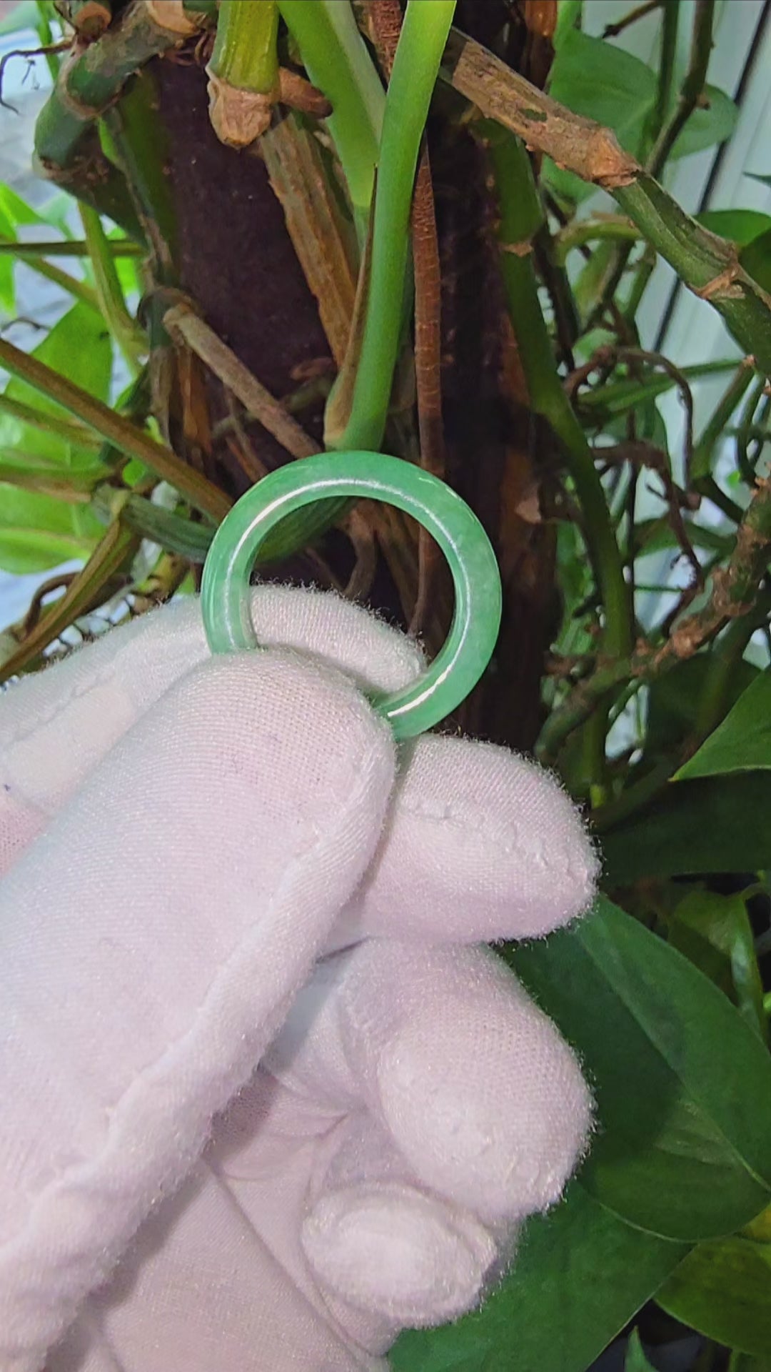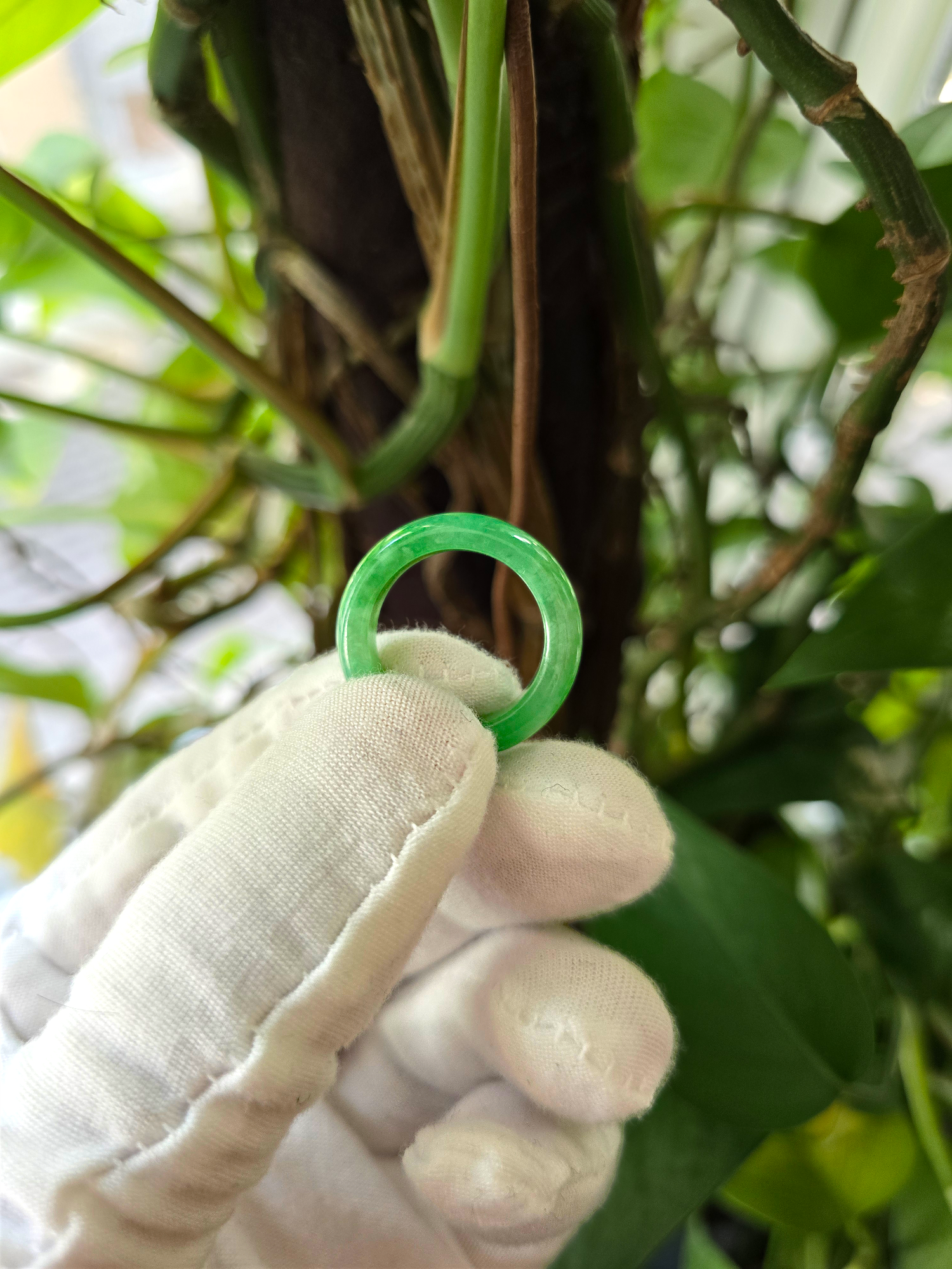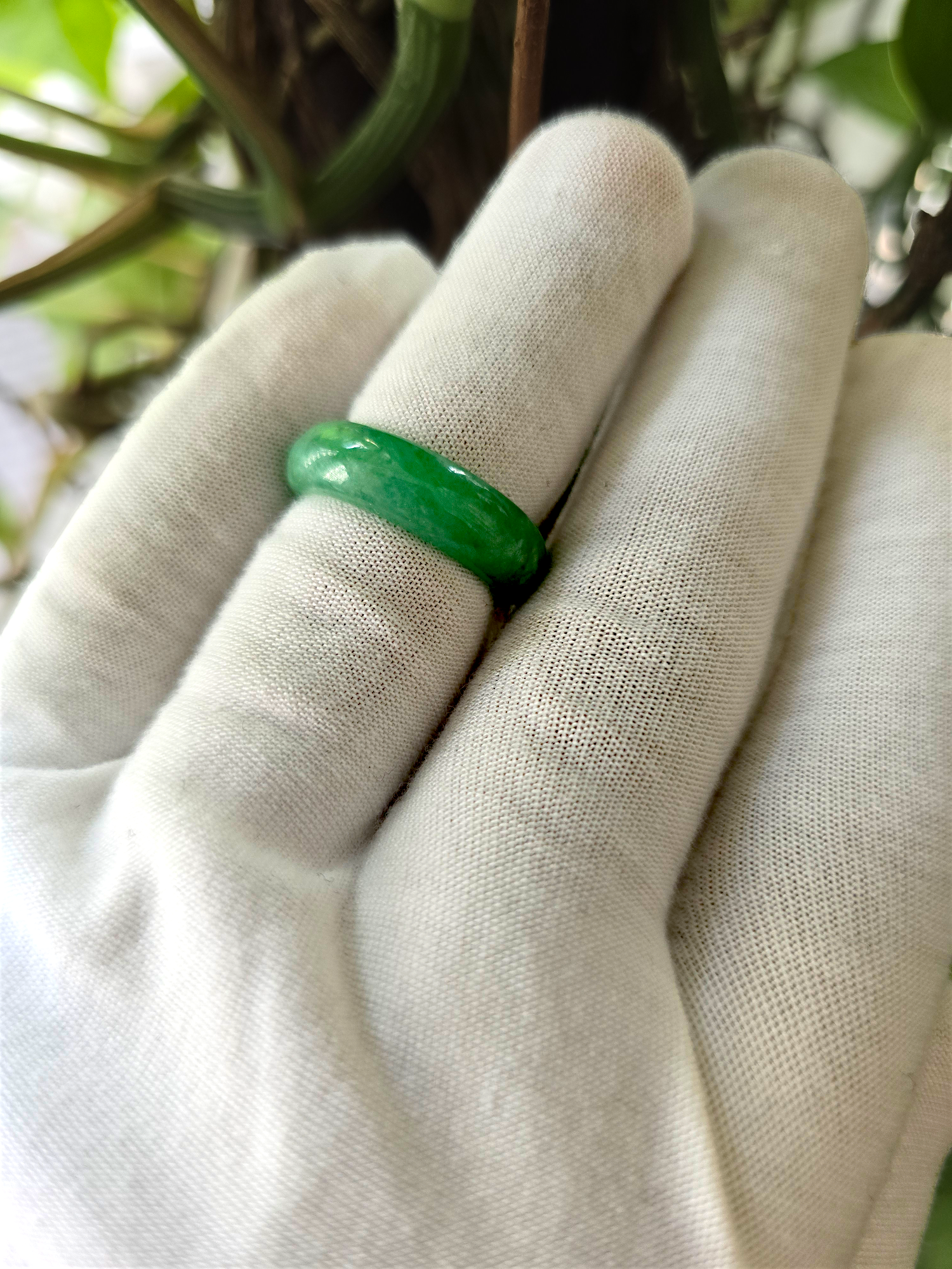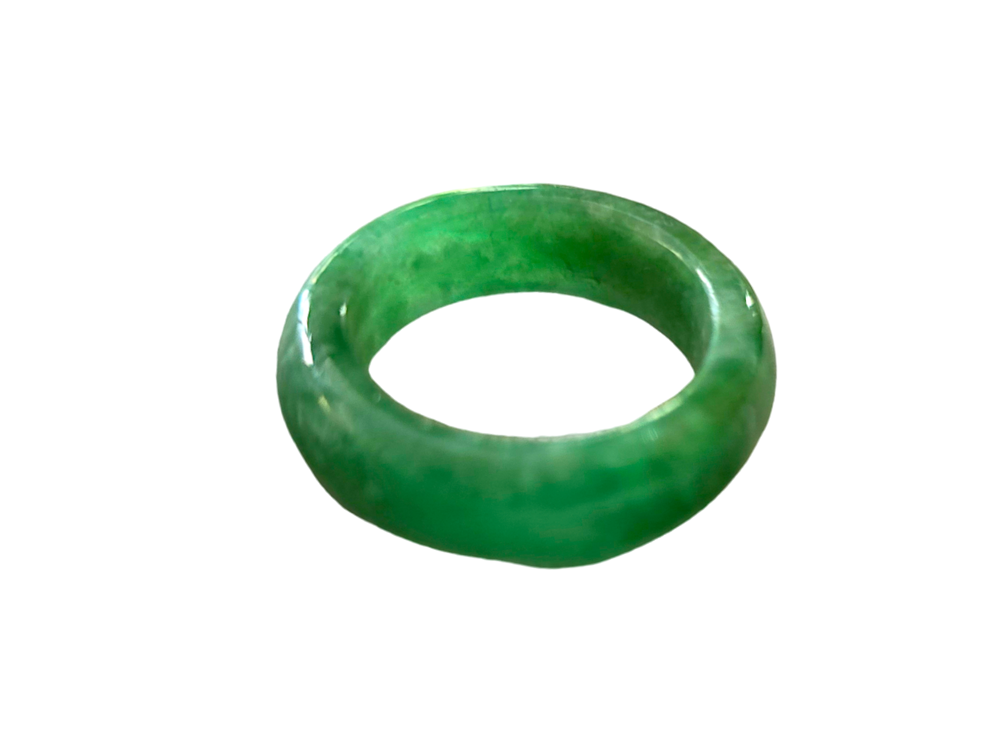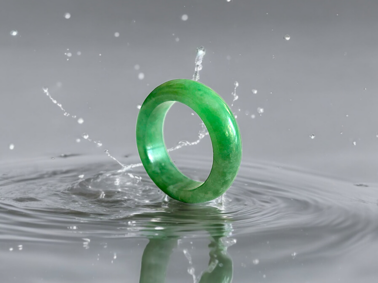 Our finest and most translucent series of Burmese A-Jadeite Infinity Band Rings. Our handpicked exclusive Jadeite is crafted into unique rings, each with the ideal optics and strength. Each ring is unique and exclusively One-of One. With fibrous interwoven hues, this jadeite has a rich green tone with splashes and streaks of Imperial Jadeite. Perfect luster and light, and no cracks or blemishes on the ring.