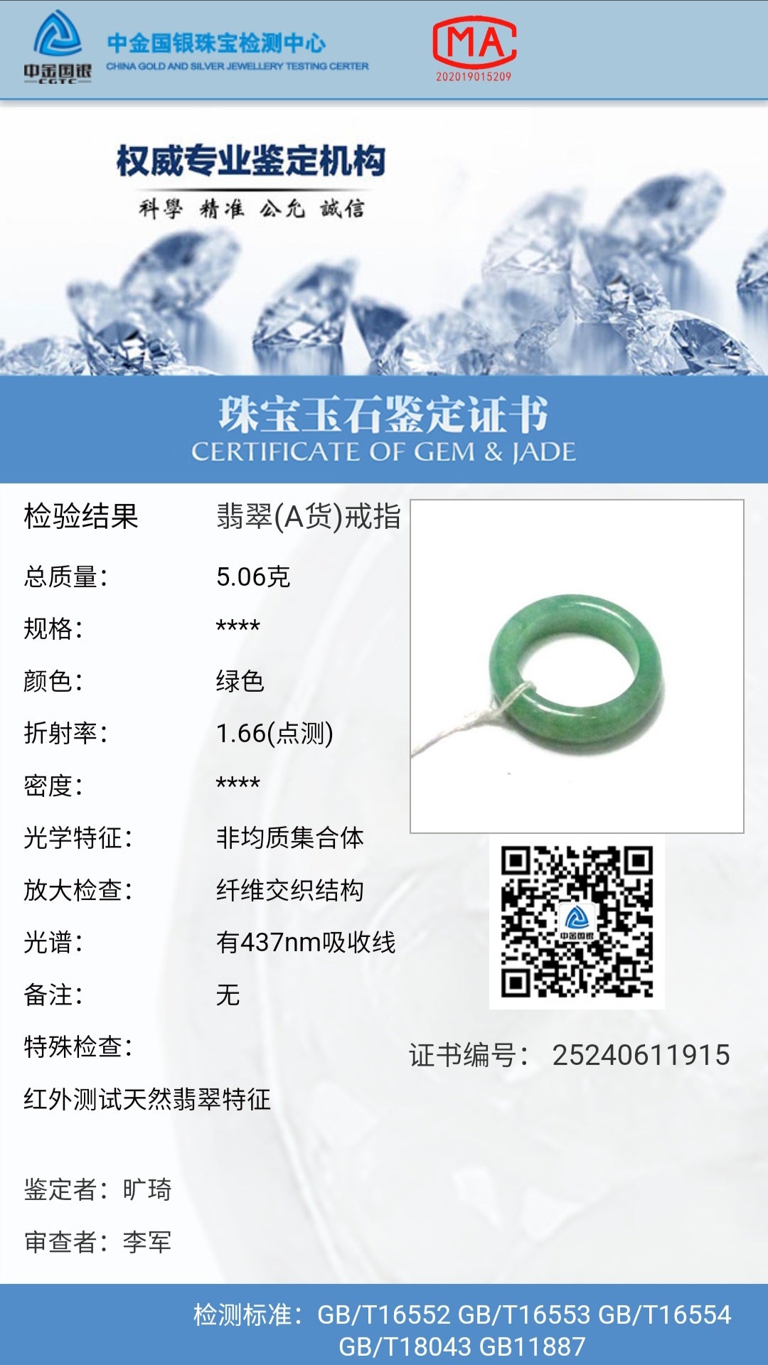 This ring is certified by the 'CGTC'' with the certificate number: 25240611915