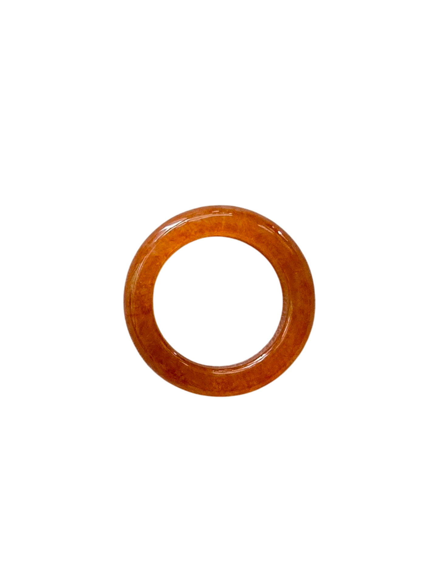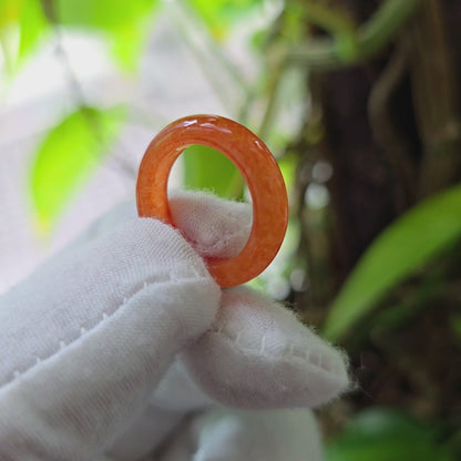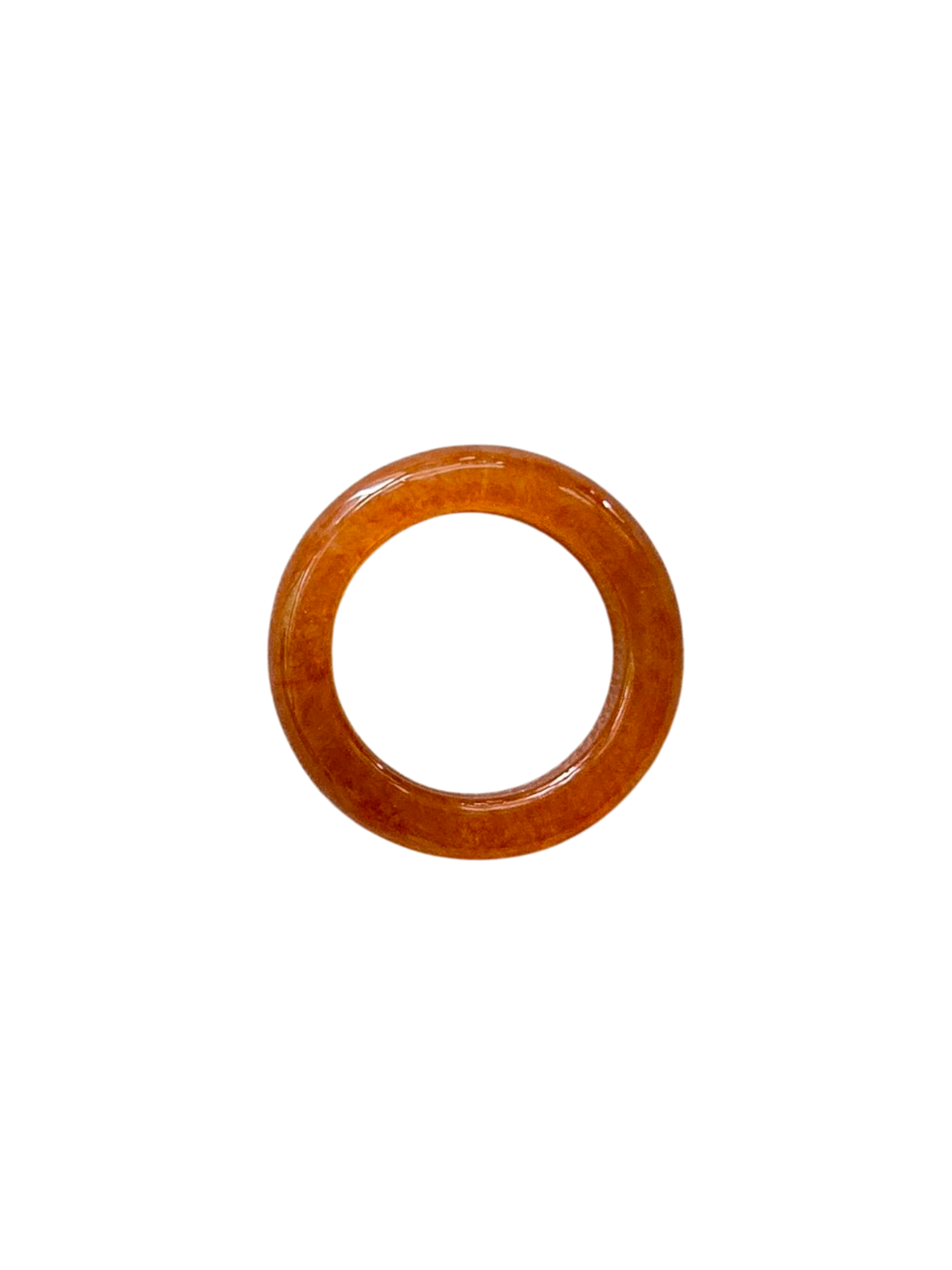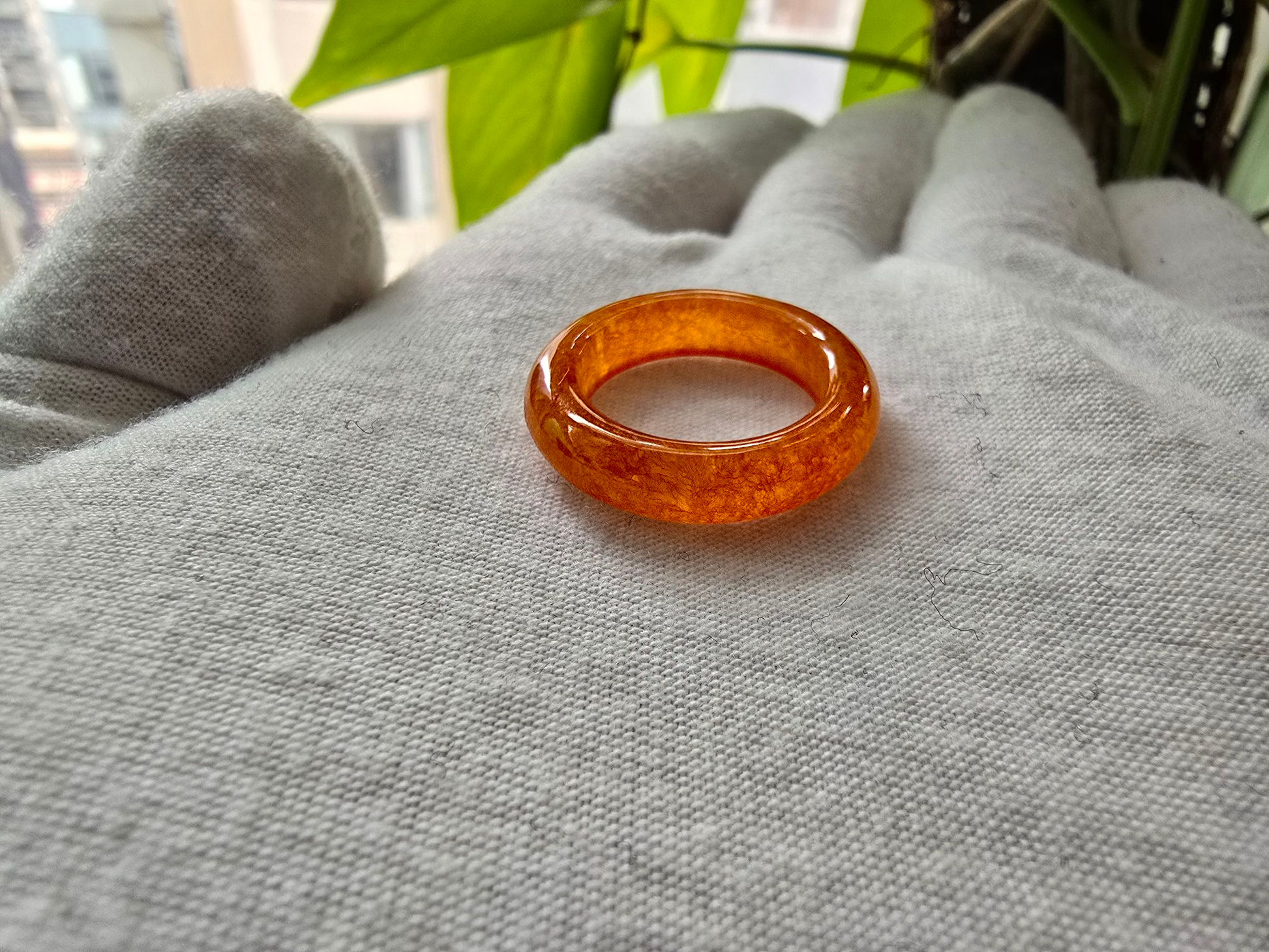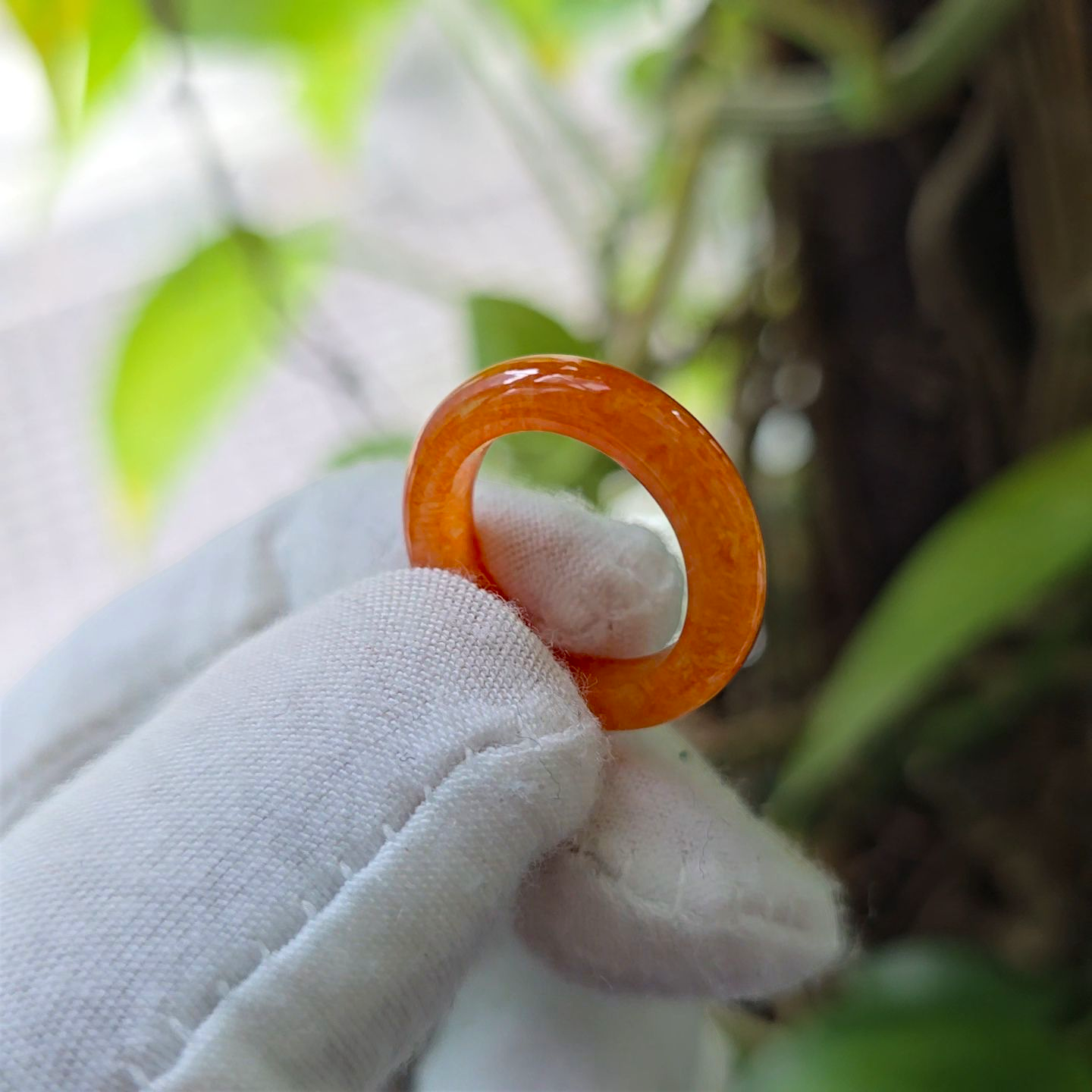 Each ring is unique and exclusively One-of One. With fibrous interwoven hues, this jadeite ring has a deep Orangey-Red tone with splashes and streaks of Intense Red Jadeite. Perfect luster and light, excellent translucency and no cracks or blemishes on the ring.