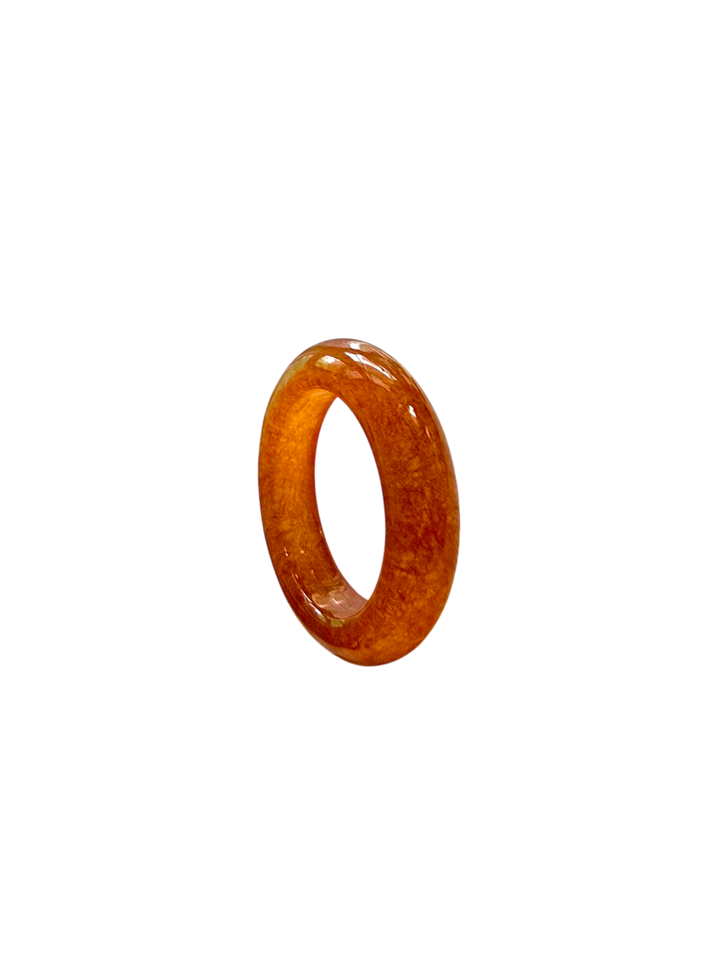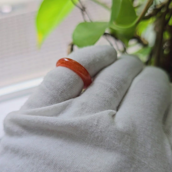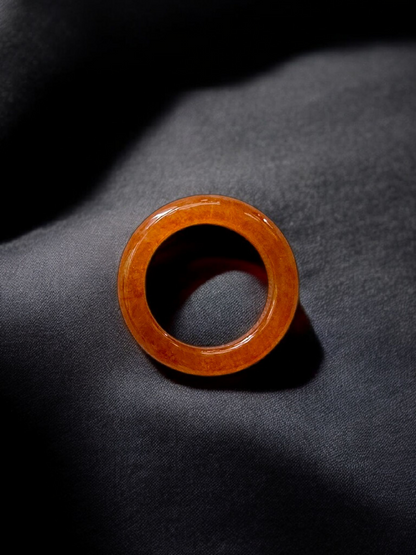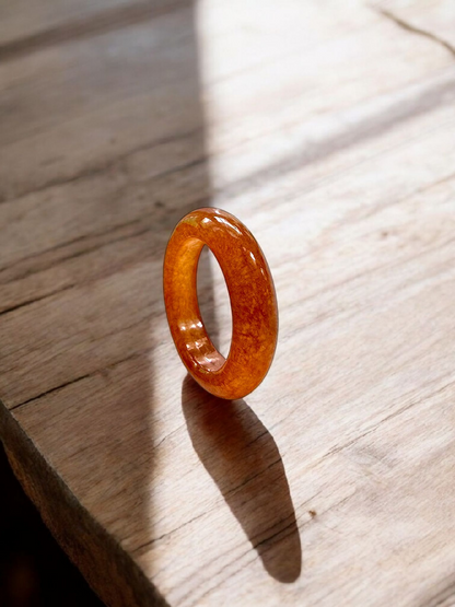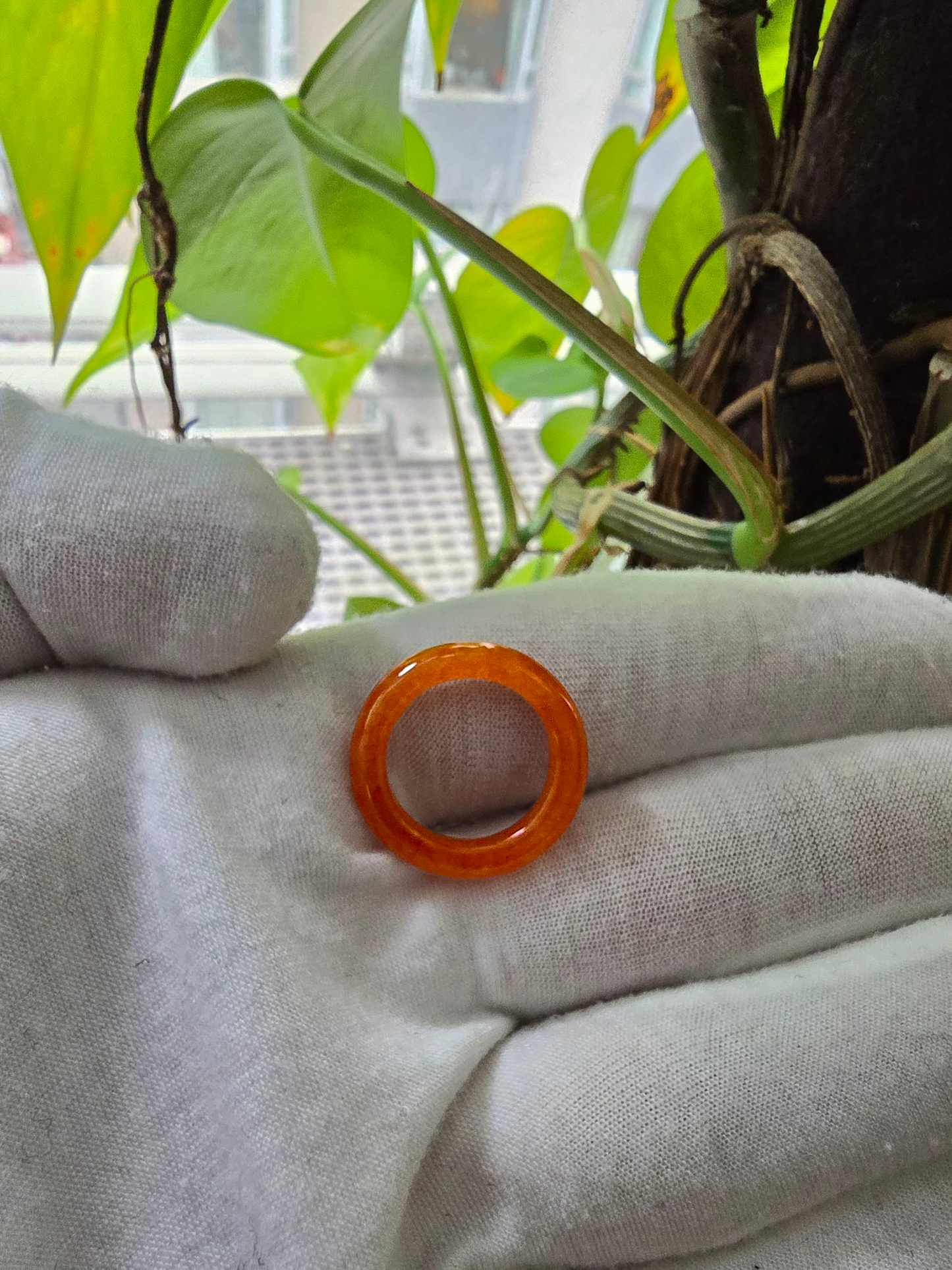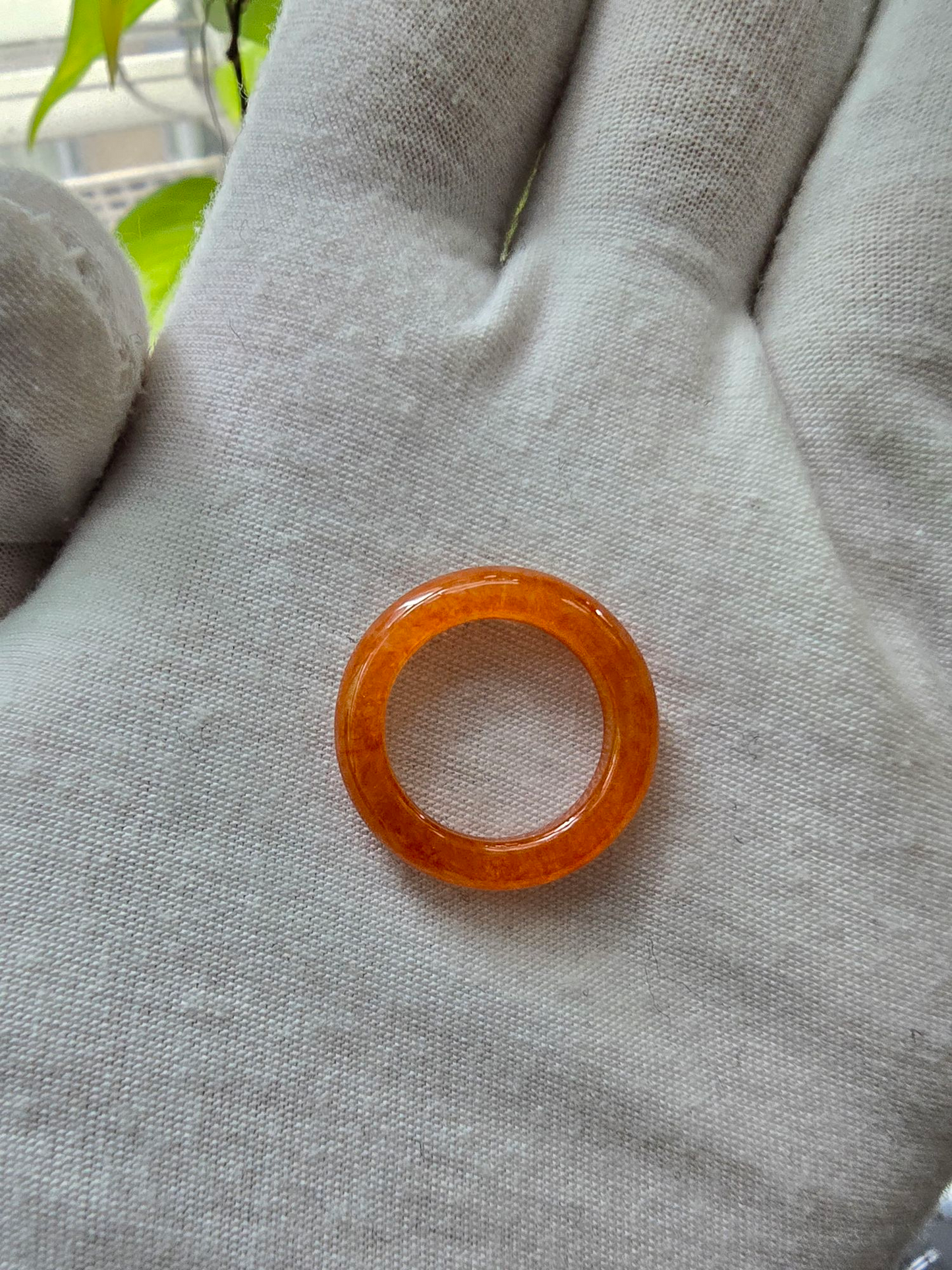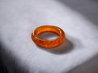 Each ring is unique and exclusively One-of One. With fibrous interwoven hues, this jadeite ring has a deep Orangey-Red tone with splashes and streaks of Intense Red Jadeite. Perfect luster and light, excellent translucency and no cracks or blemishes on the ring.
