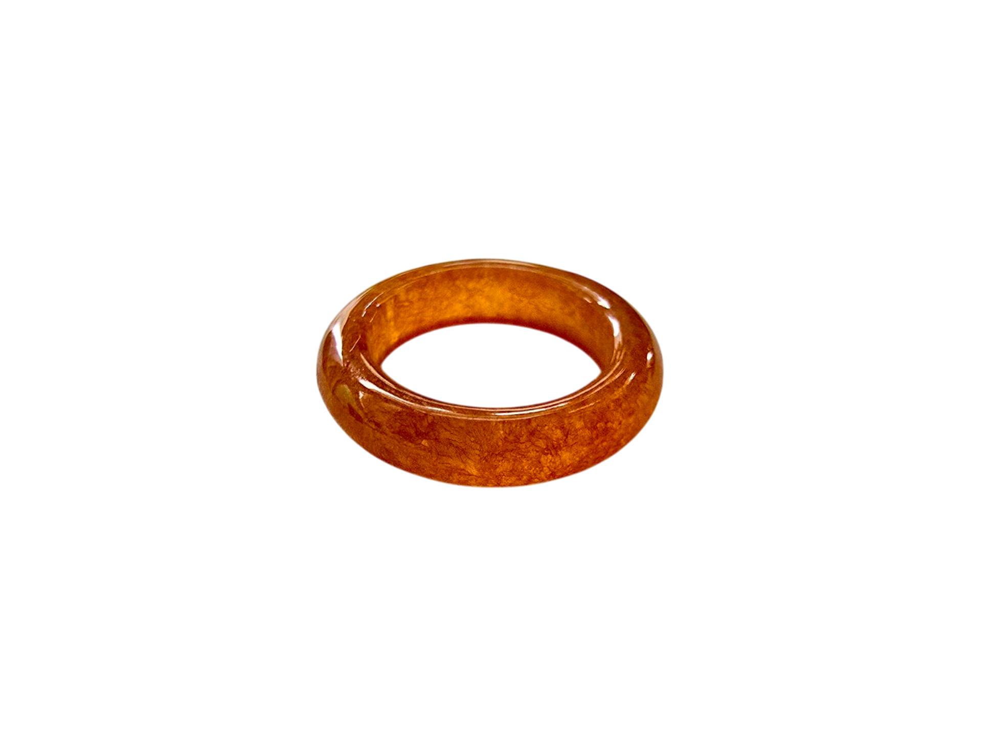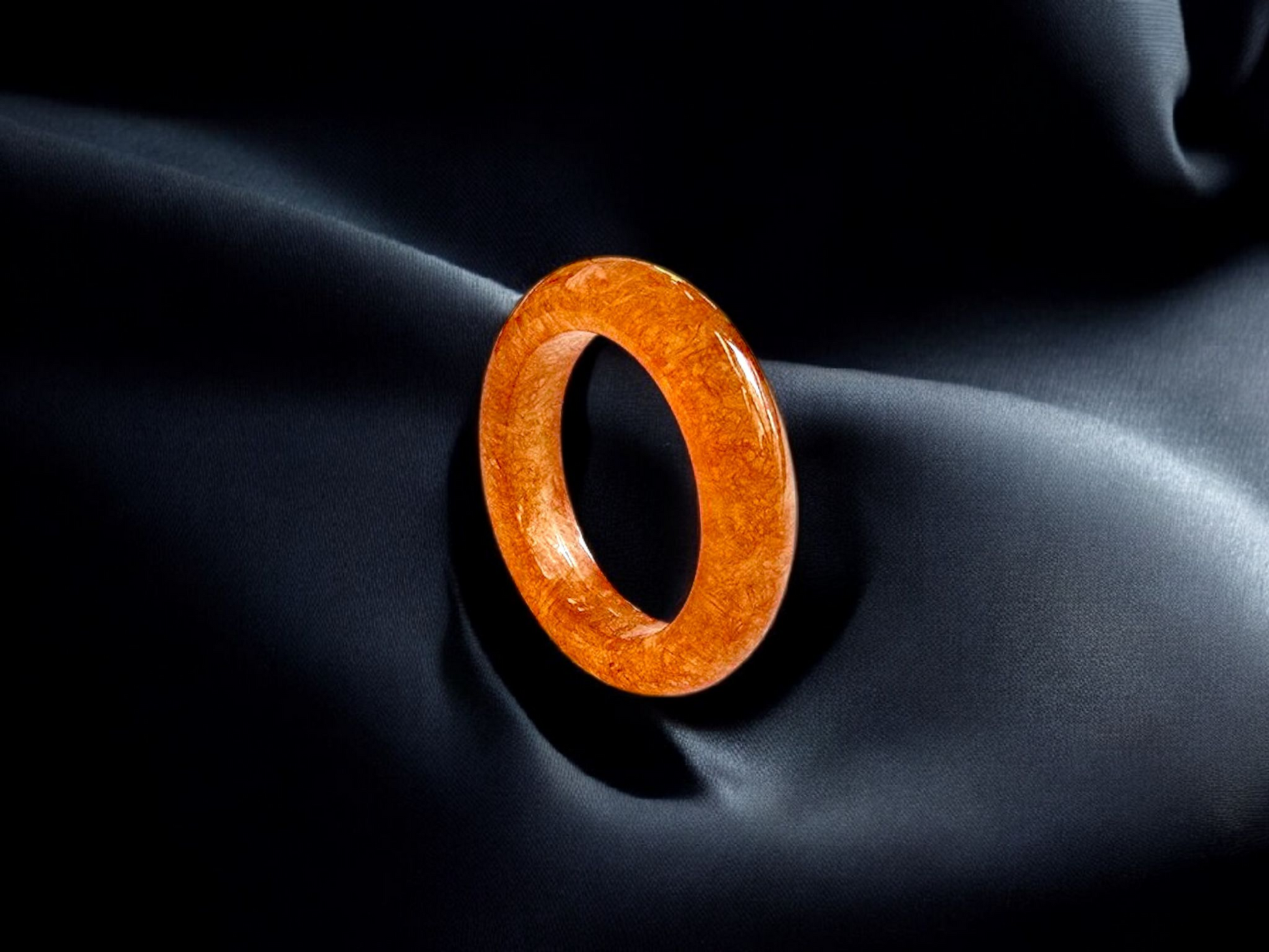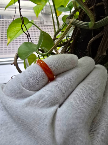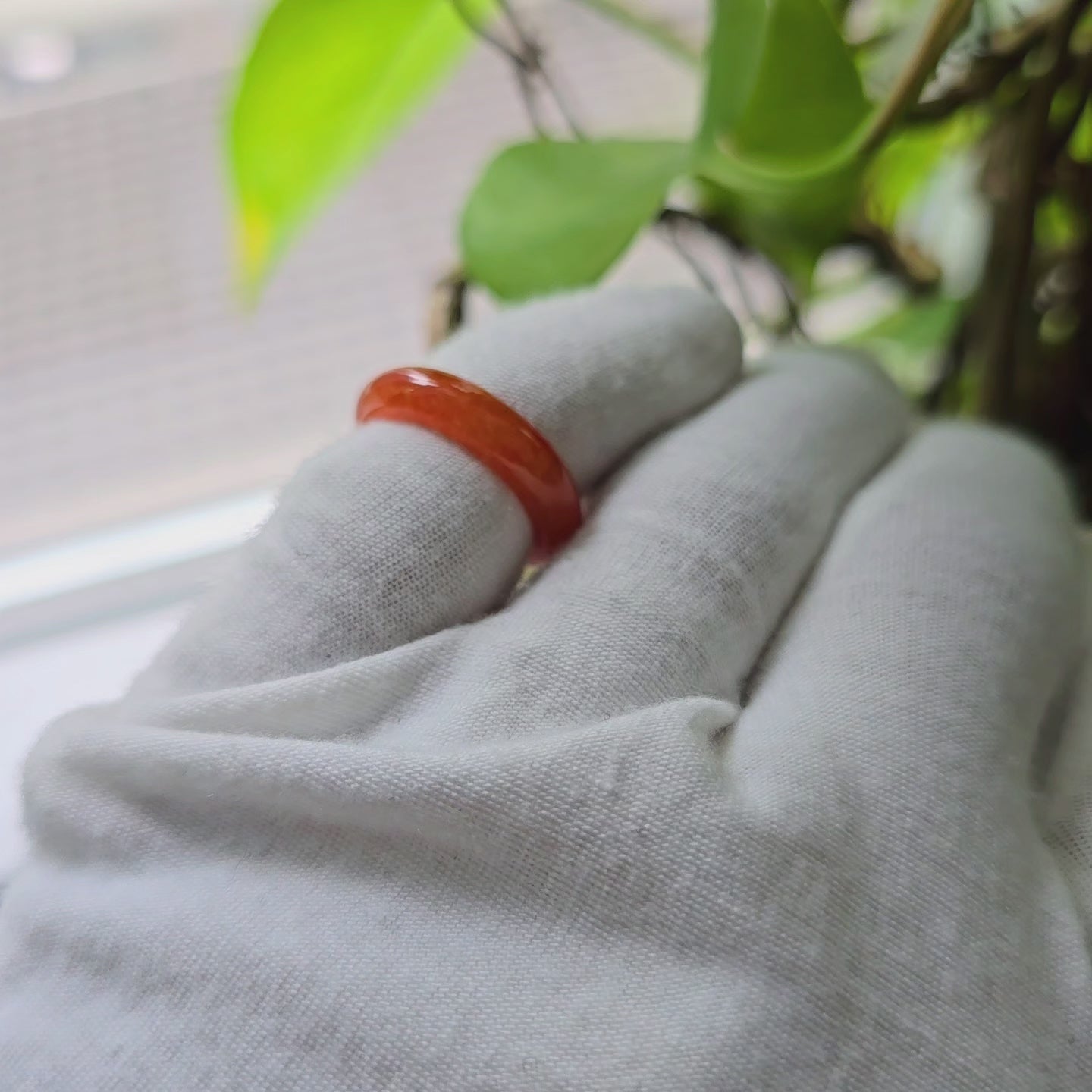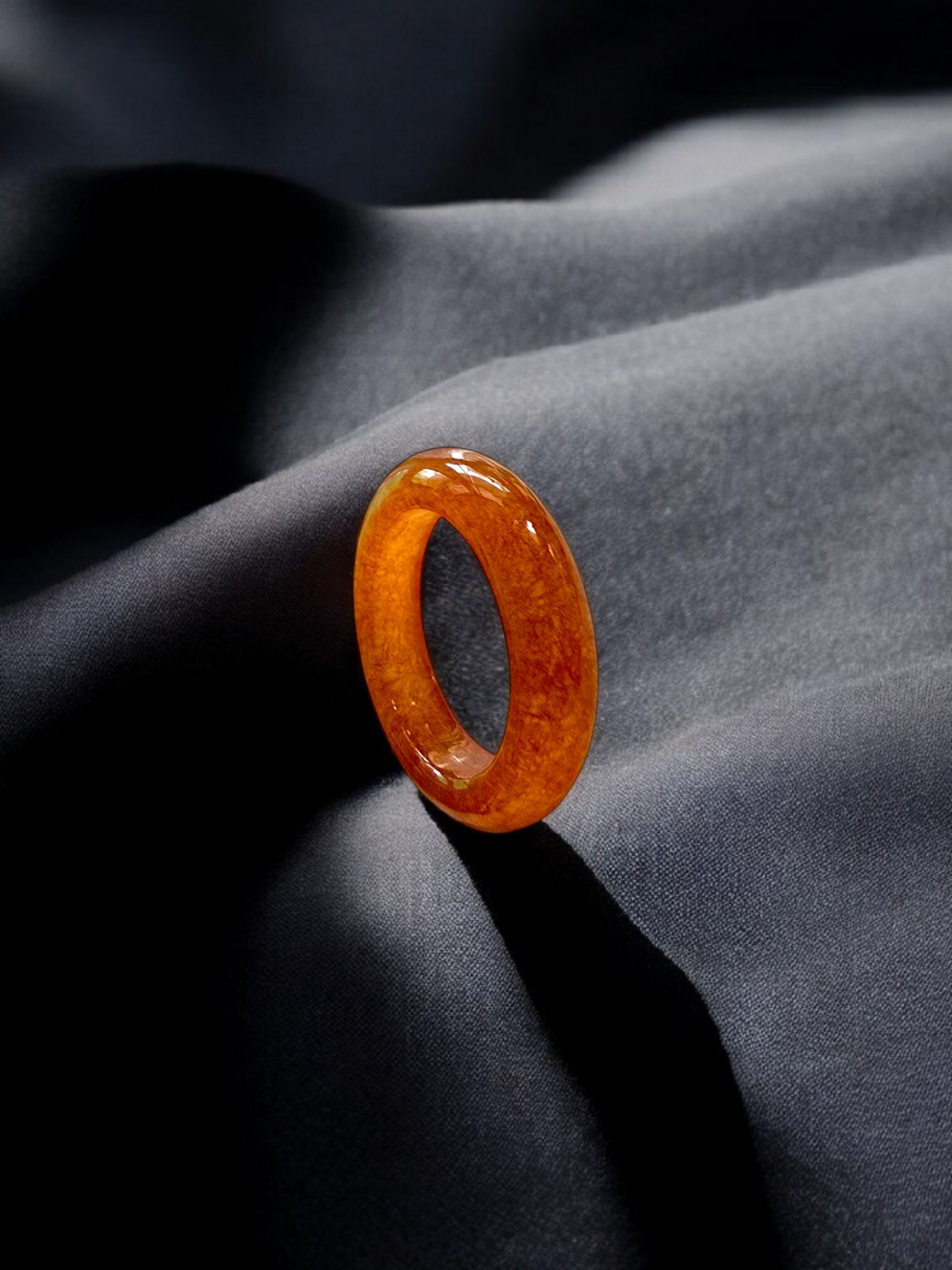 Each ring is unique and exclusively One-of One. With fibrous interwoven hues, this jadeite ring has a deep Orangey-Red tone with splashes and streaks of Intense Red Jadeite. Perfect luster and light, excellent translucency and no cracks or blemishes on the ring.