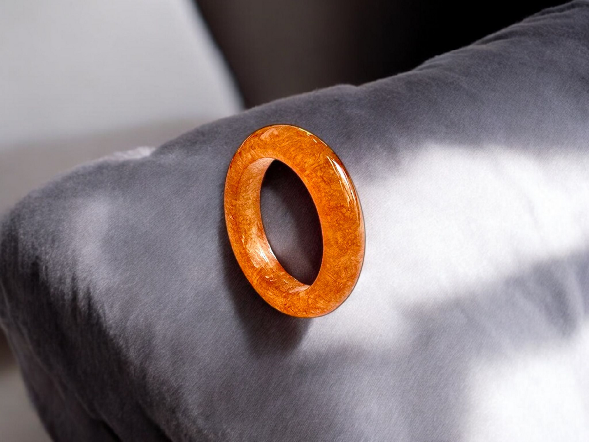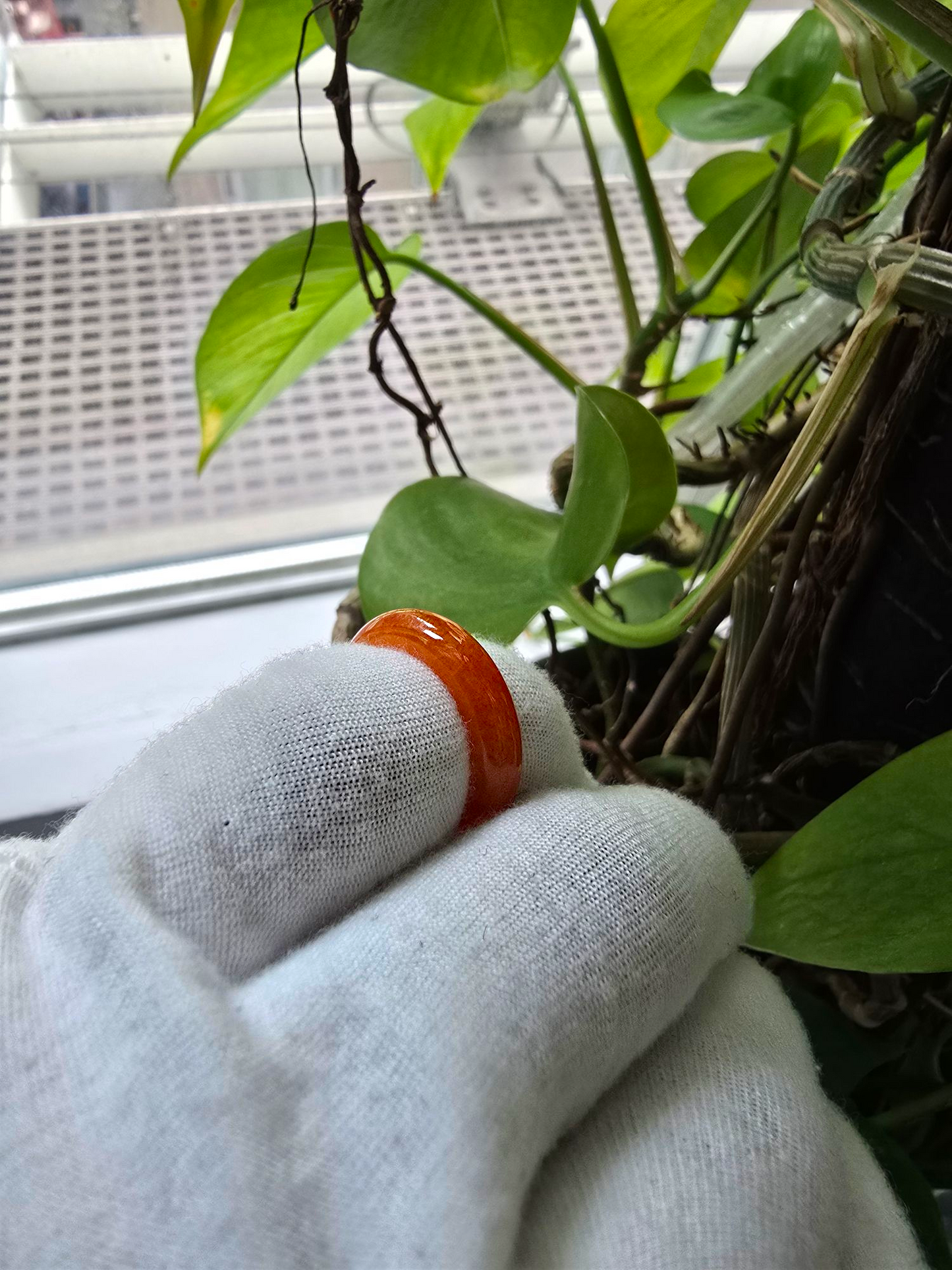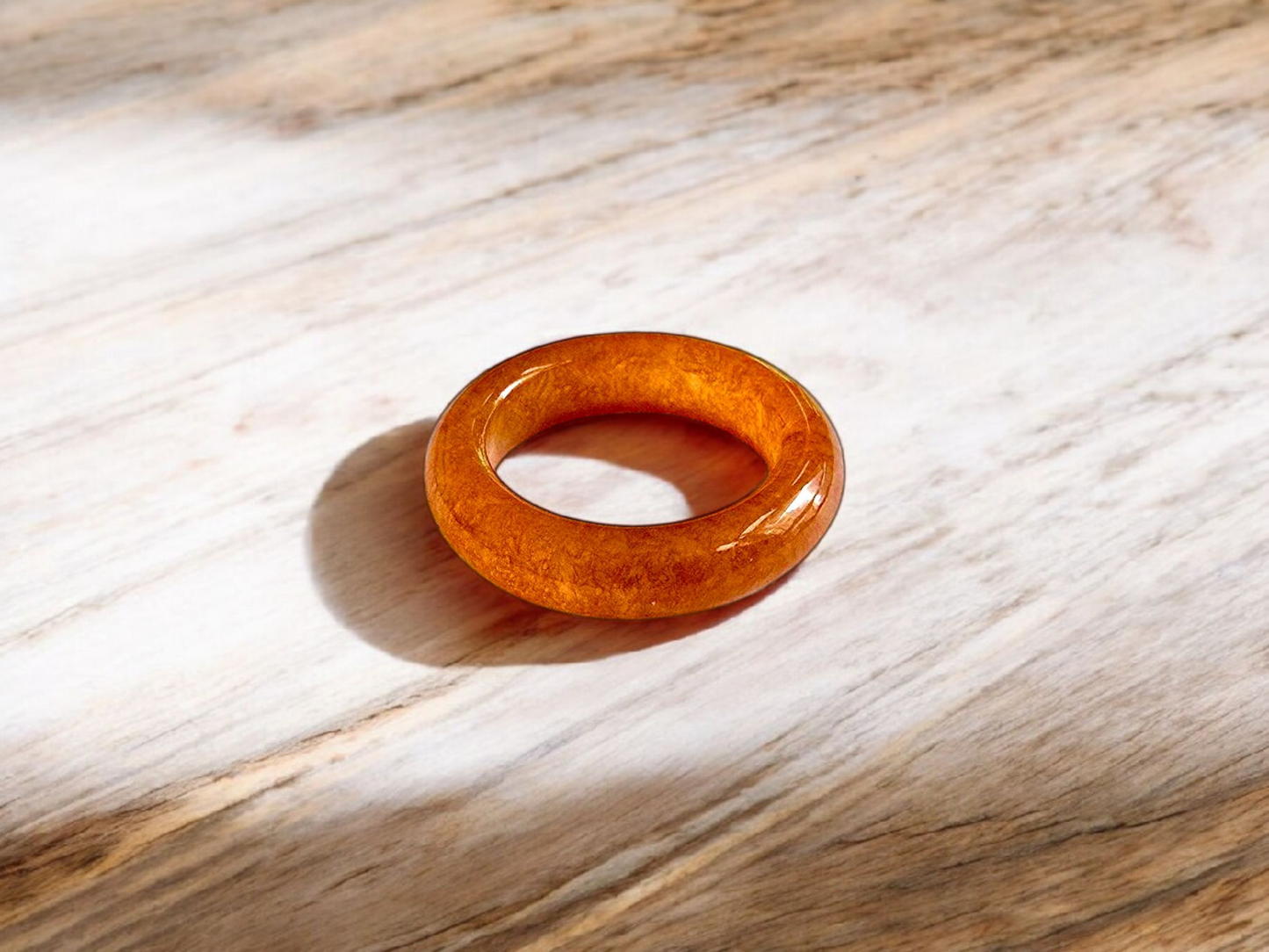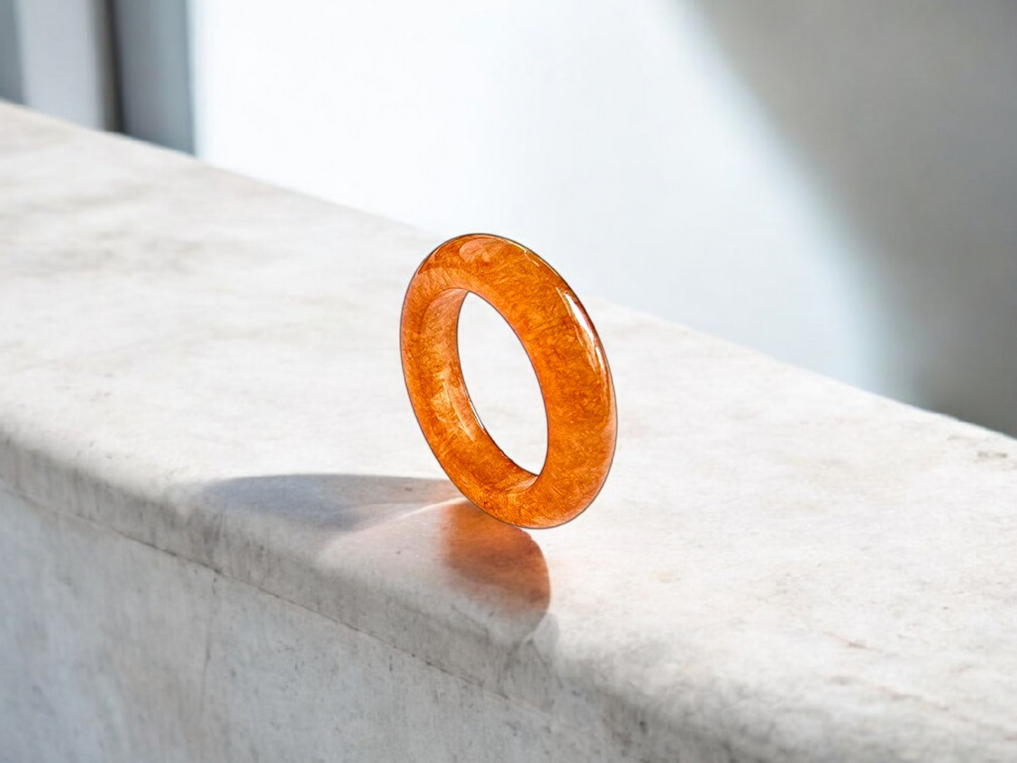Each ring is unique and exclusively One-of One. With fibrous interwoven hues, this jadeite ring has a deep Orangey-Red tone with splashes and streaks of Intense Red Jadeite. Perfect luster and light, excellent translucency and no cracks or blemishes on the ring.