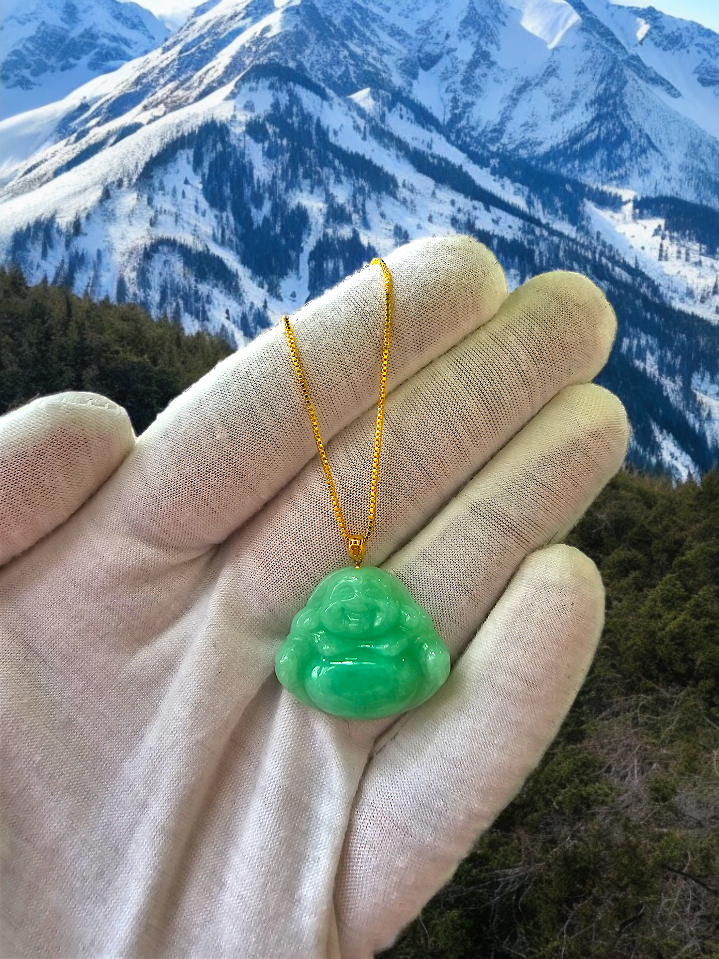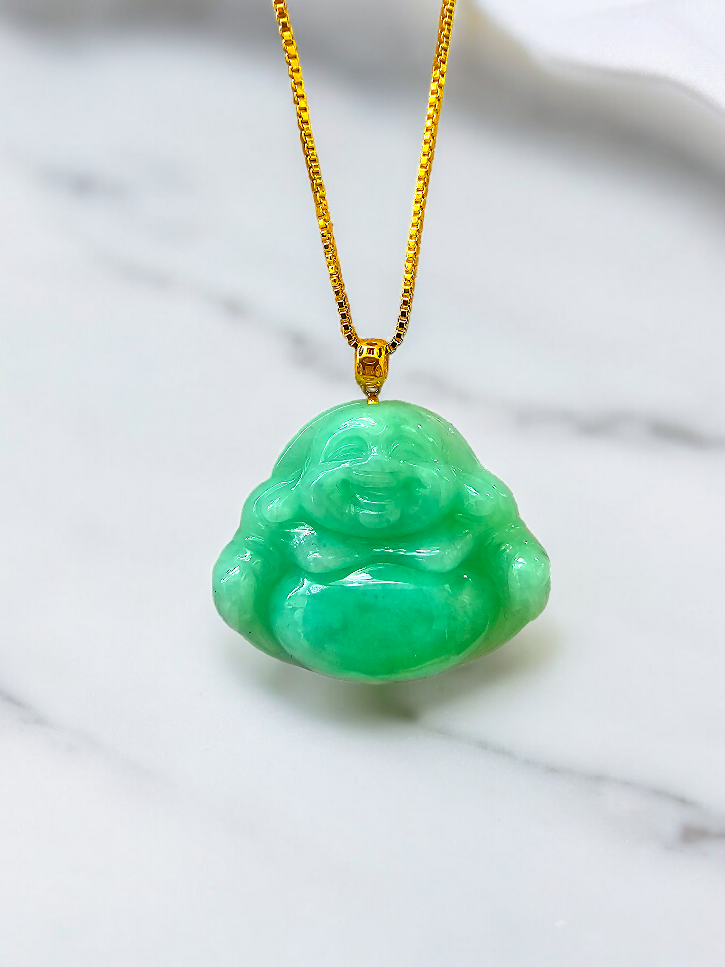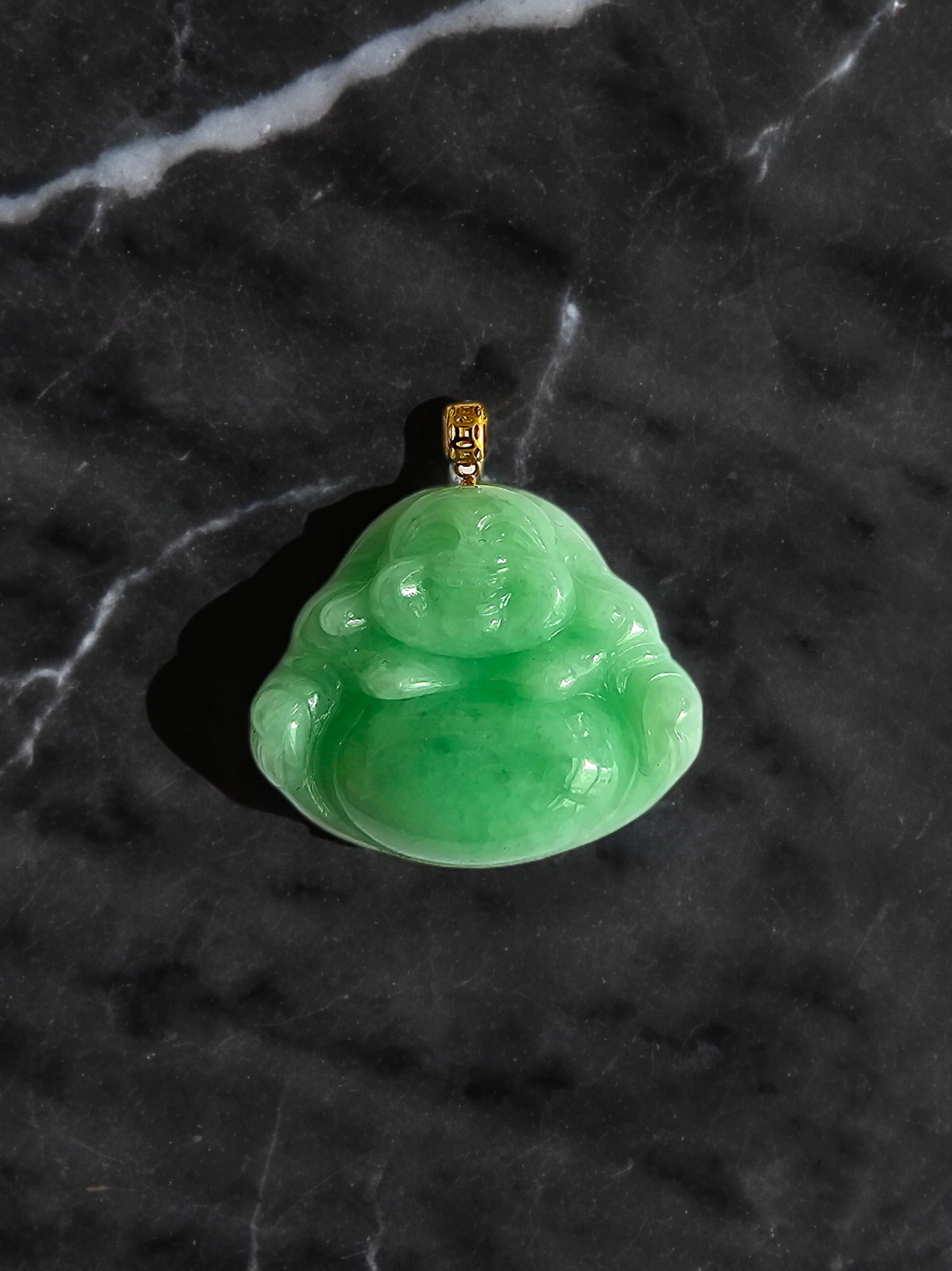 Prosperous Laughing Buddha Burmese A-Jadeite Pendant (with 18K Yellow Gold) - Certified