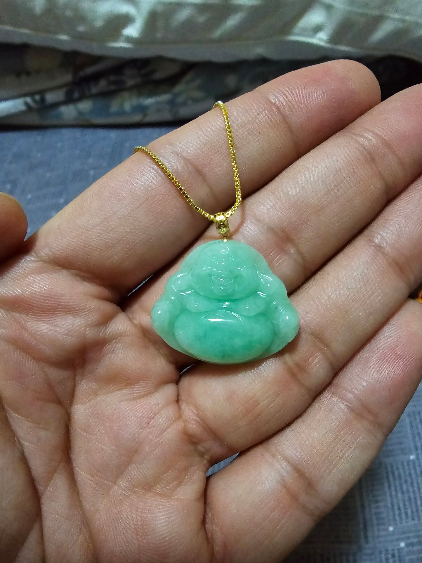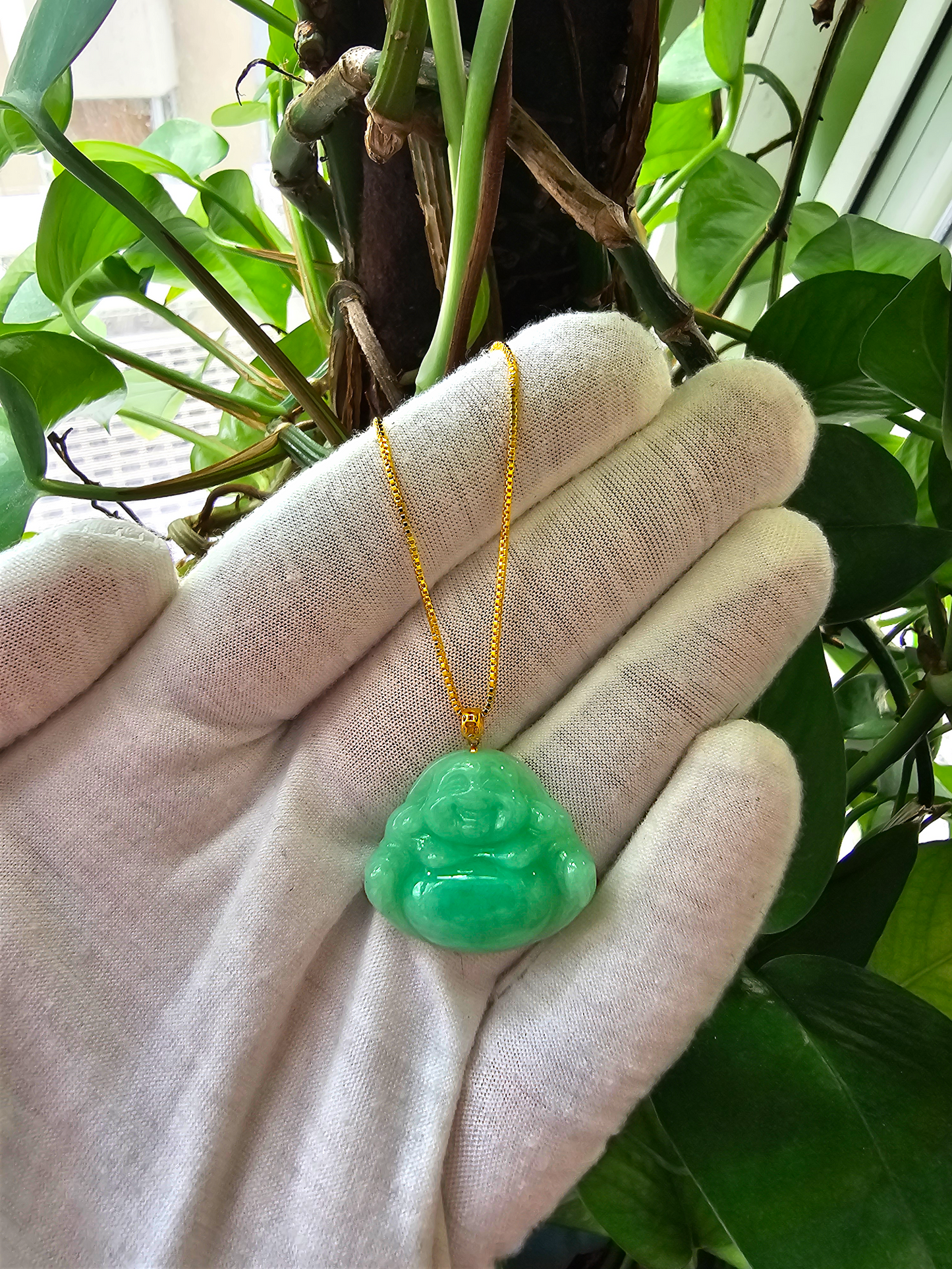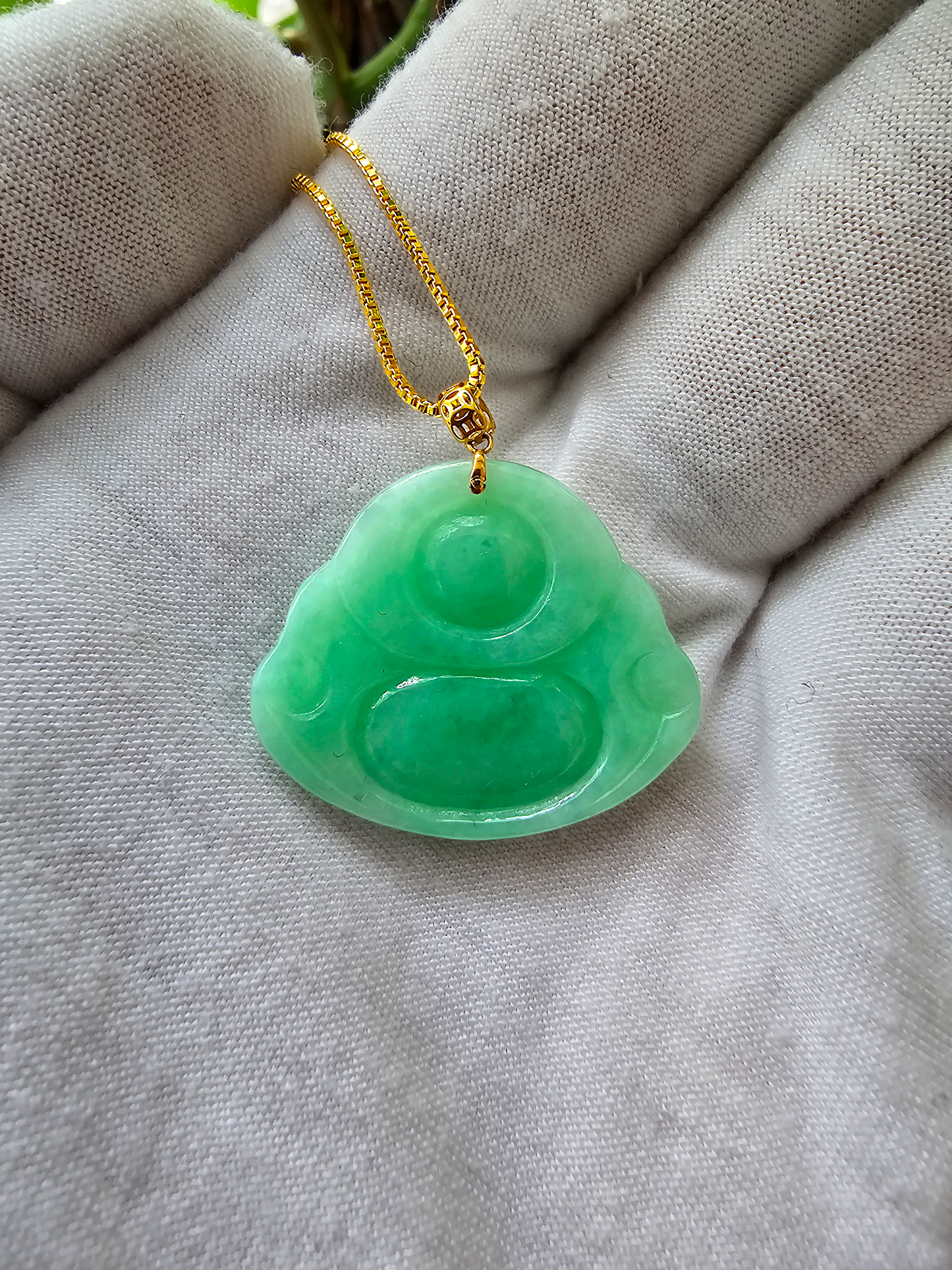 Prosperous Laughing Buddha Burmese A-Jadeite Pendant (with 18K Yellow Gold) - Certified
