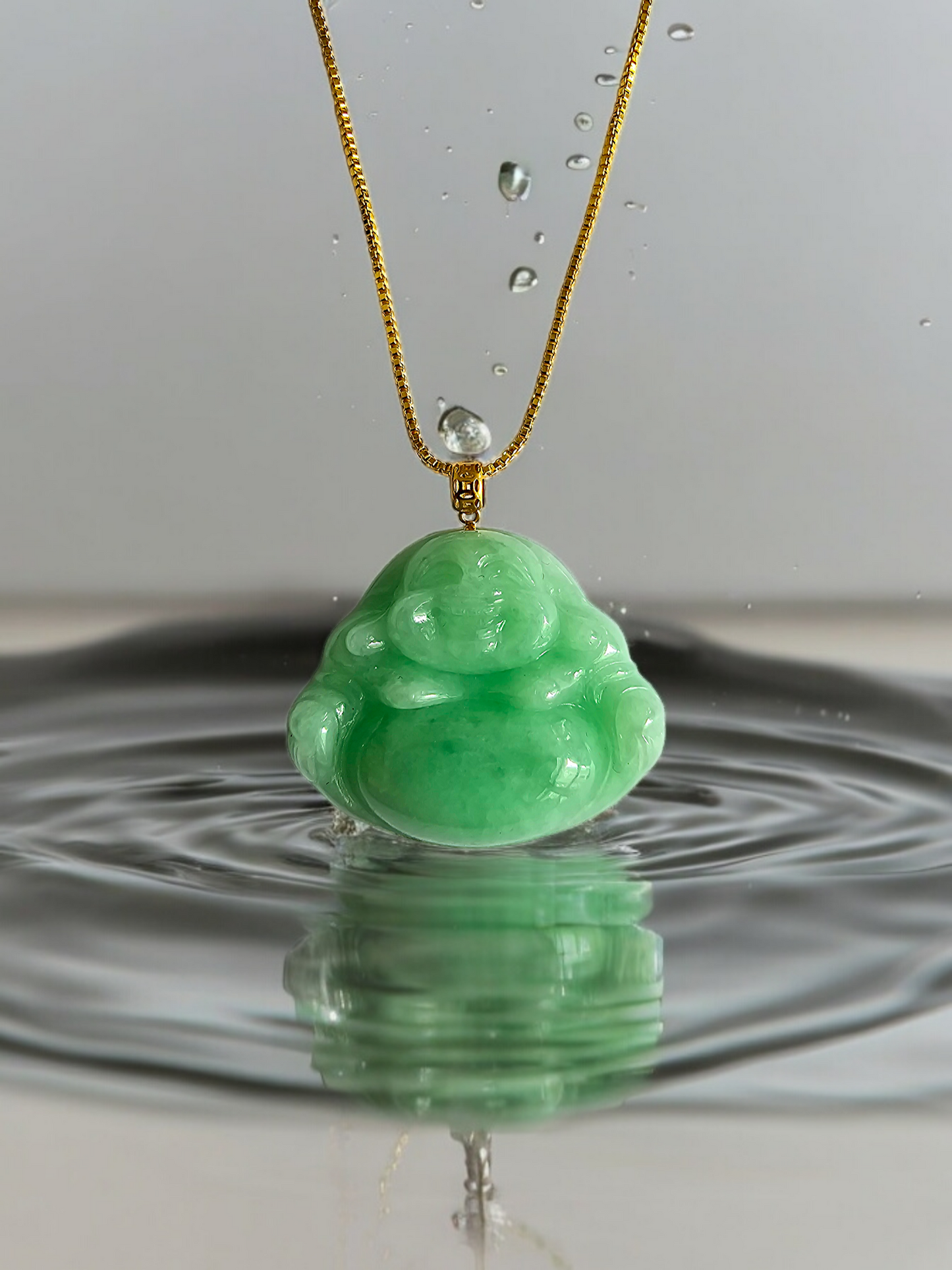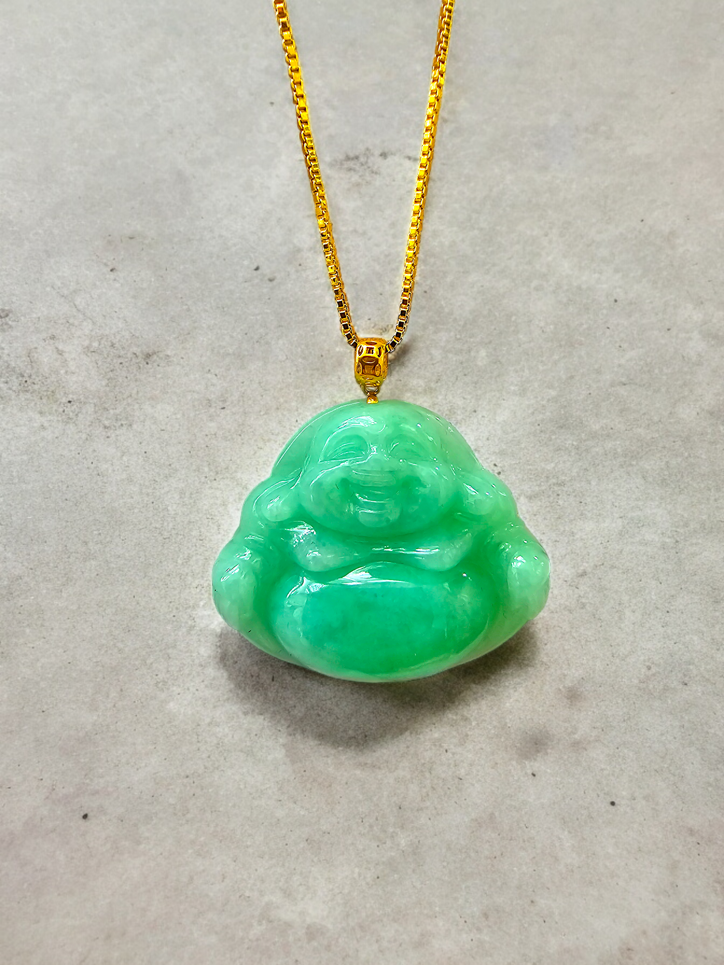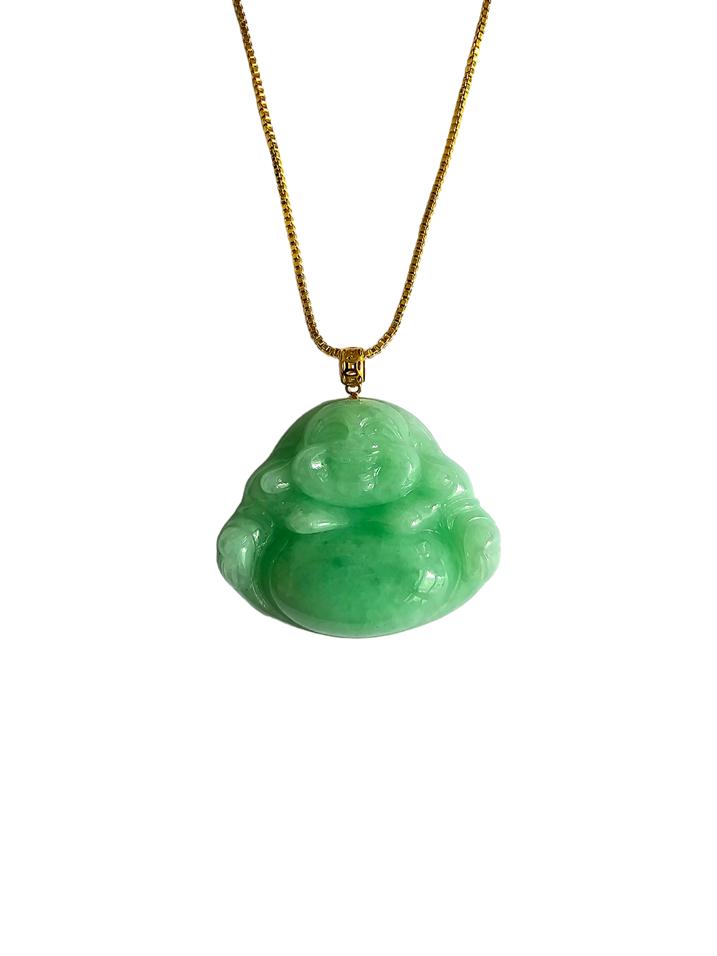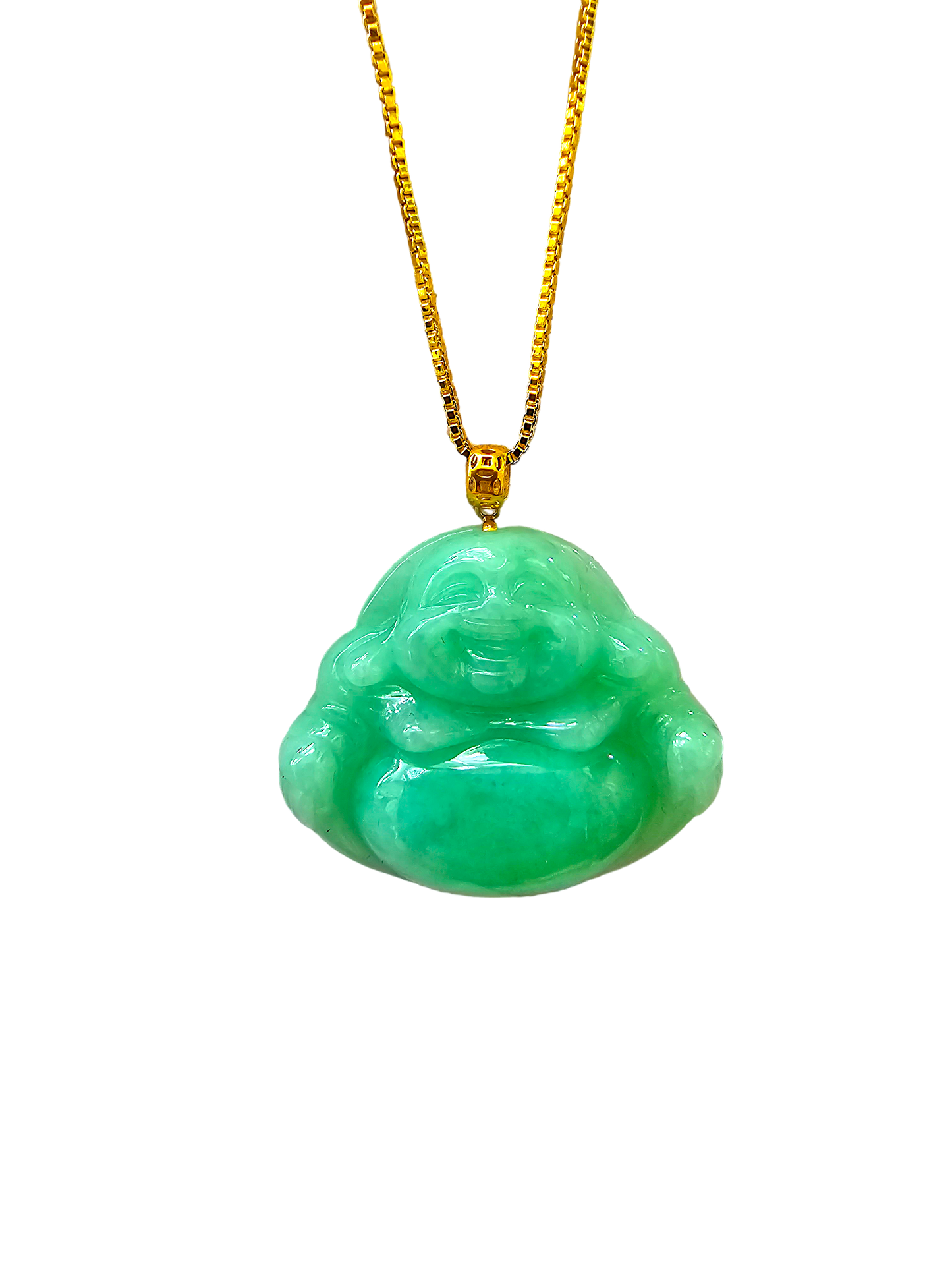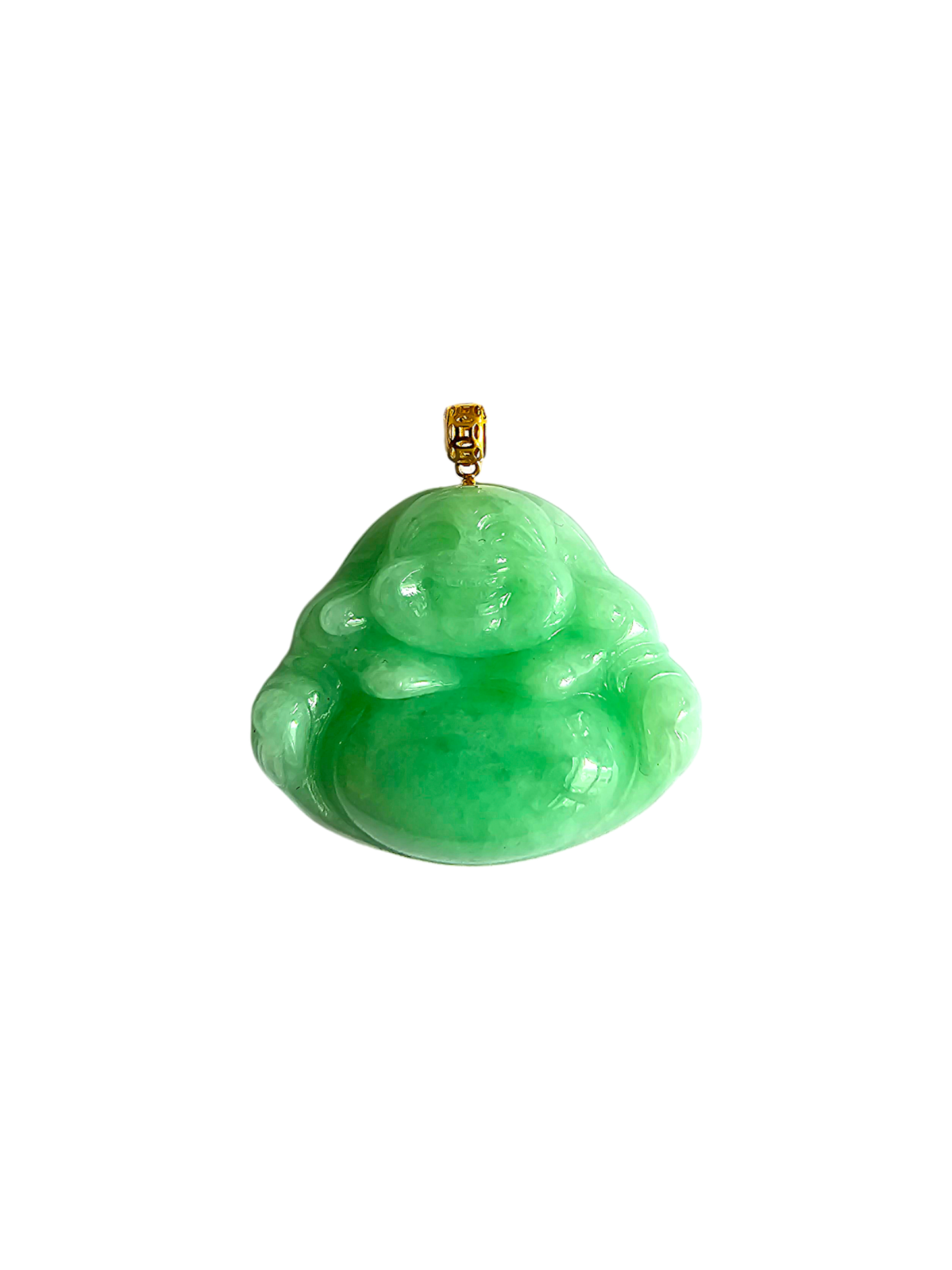 The Prosperous Laughing Buddha Burmese A-Jadeite Pendant is a classic FYORO design, symbolizing the history of the orient.