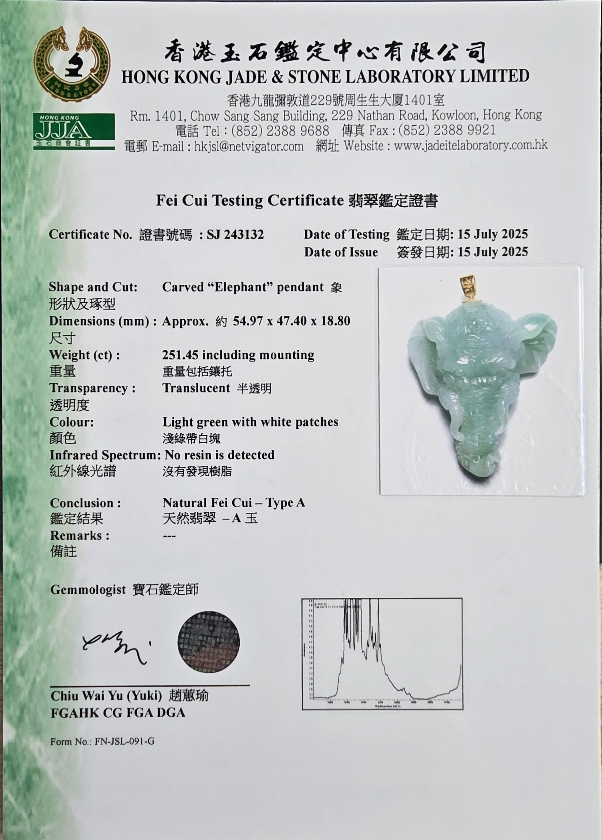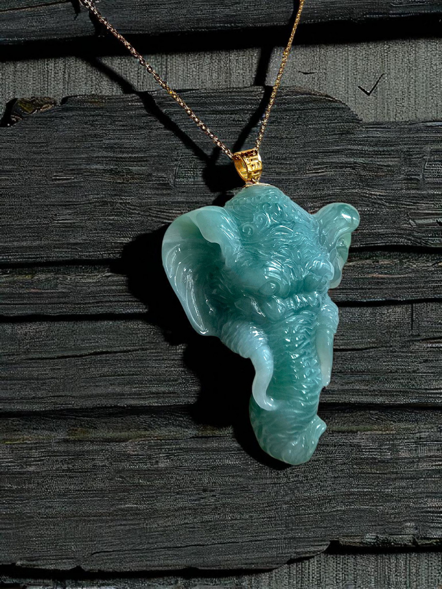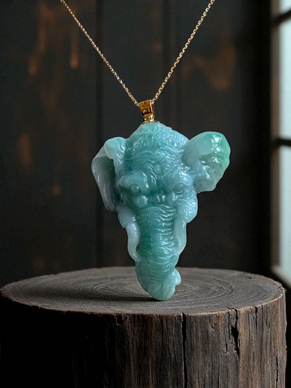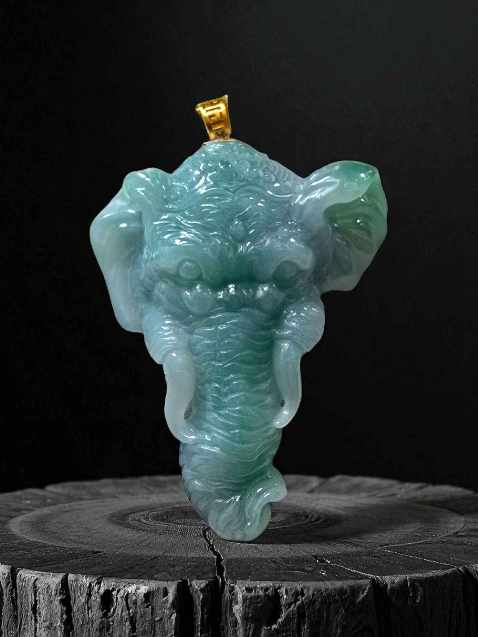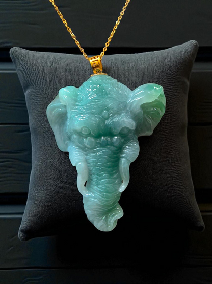 Wise Elephant Head Burmese A-Jadeite Pendant (with 18K Yellow Gold) - HKJSL Certified