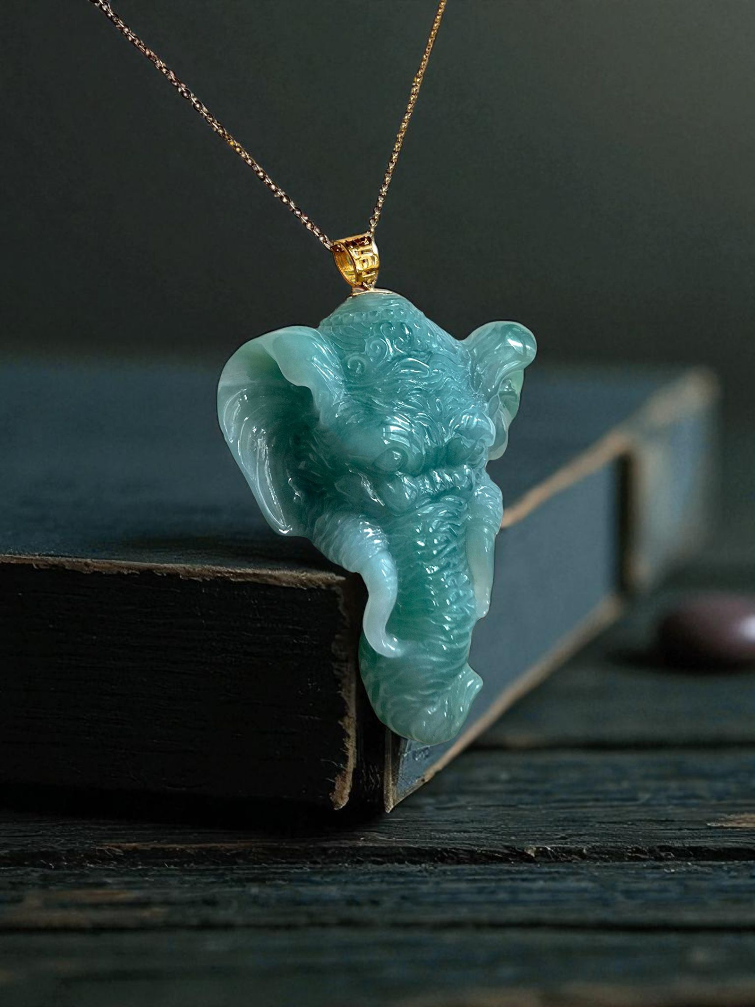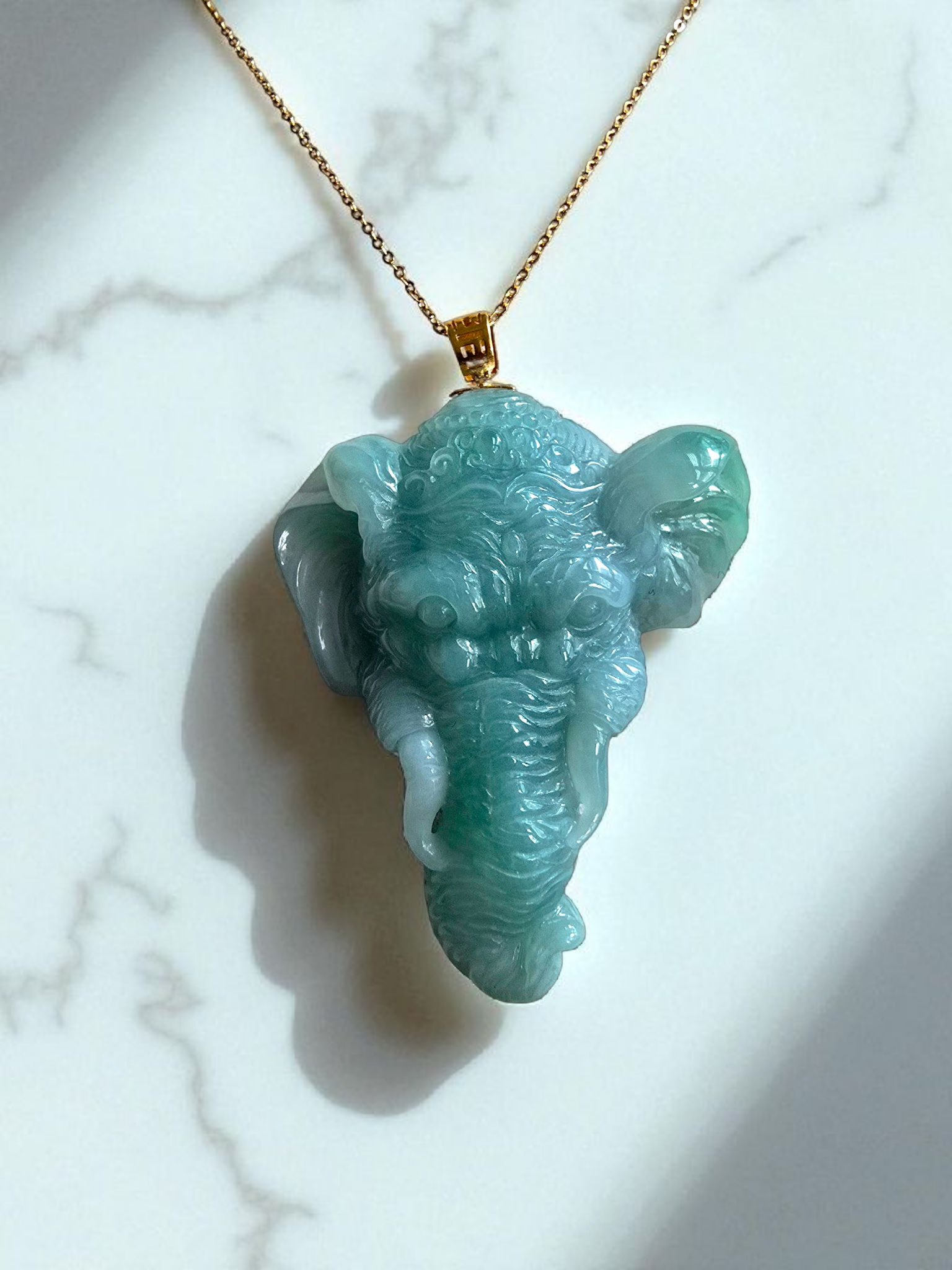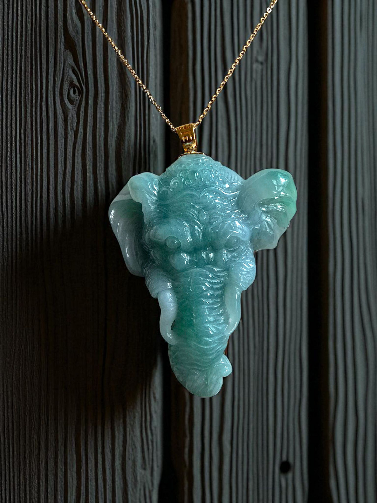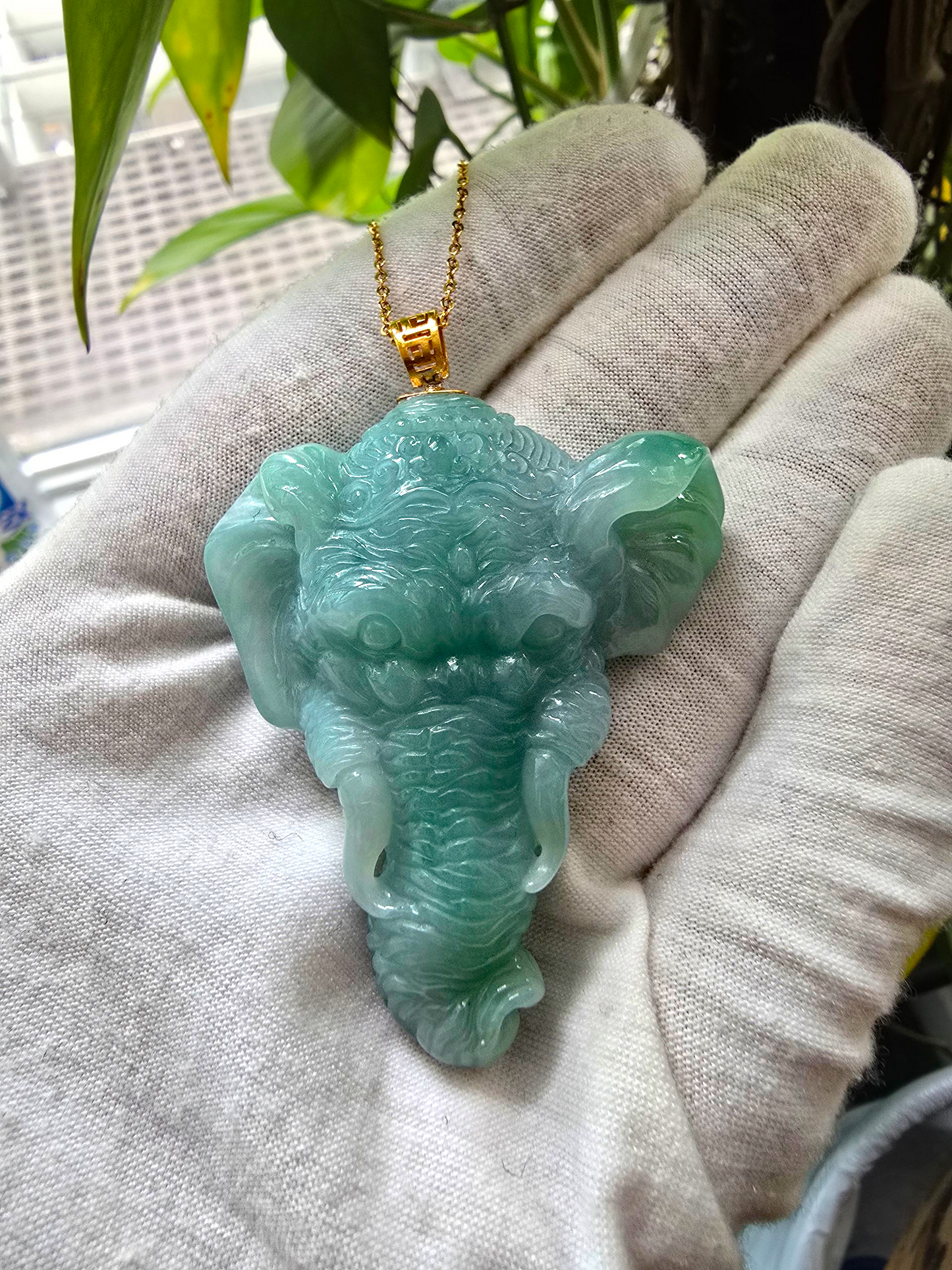 Wise Elephant Head Burmese A-Jadeite Pendant (with 18K Yellow Gold) - HKJSL Certified