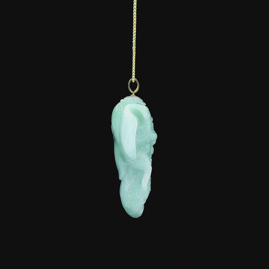Crafted by our expert artisans, this pendant is made from handpicking the rarest Burmese A-Jadeite, with the best translucency, hues, tones and saturation of green. This icy pendant has Green Base hues, with deep green and white patches to create a stunning carved pendant. This pendant exhibits supreme translucency and icy effects, with a smooth watery texture. We finish the story with our flagship 18K Yellow Gold Clasp. This pendant is the pinnacle of design and craftsmanship.
